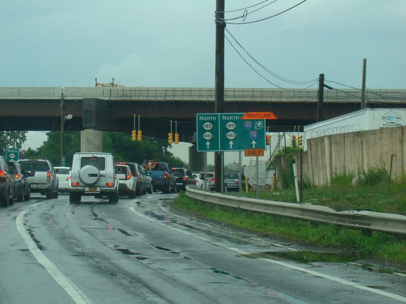 These pictures show the interchange with the Newark Bay Extension of the New Jersey Turnpike (I-78) as it appeared while construction work was in progress in the area. All of the signs shown have been replaced.