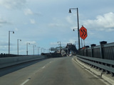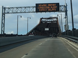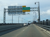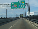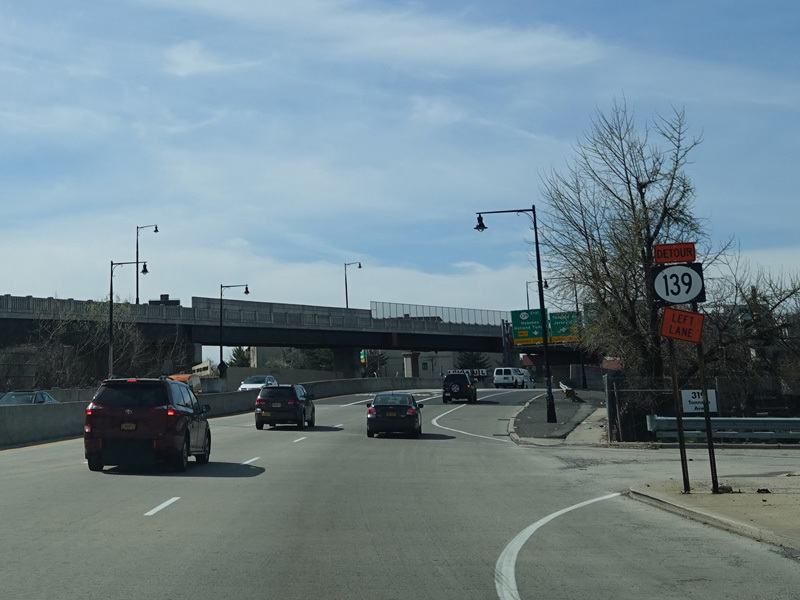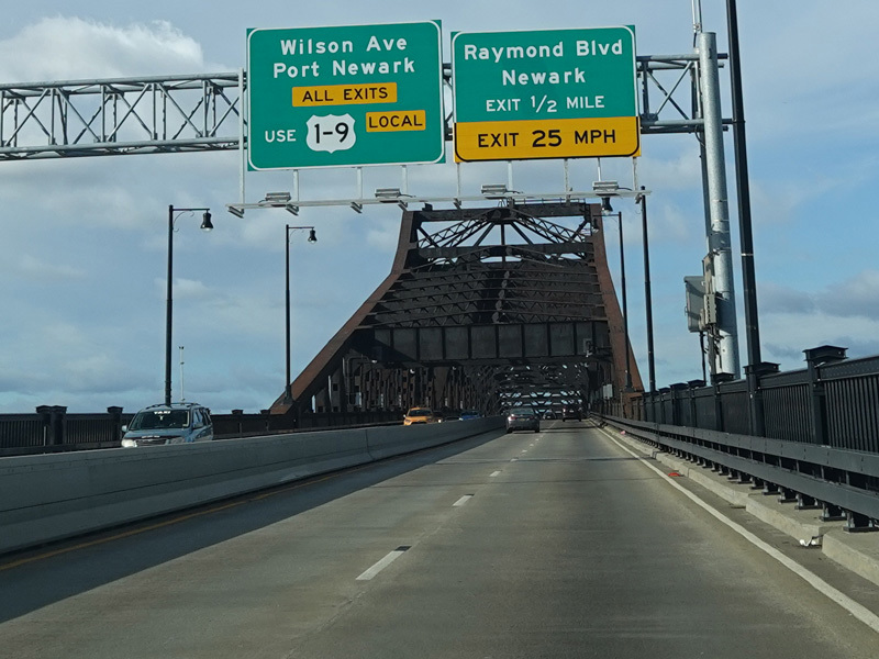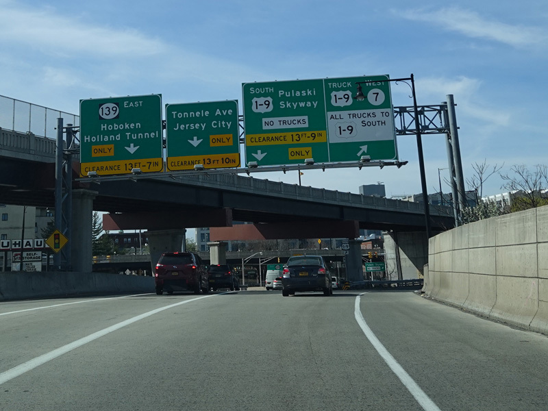 Skipping a few miles to the south, the roadway splits. Use the left lane for NJ 139 east to the Holland Tunnel (I-78). Use the center lane for Tonnele Avenue, which is a local street straight ahead. Use the right lane to stay on US 1/US 9. Trucks are prohibited from the mainline ahead and must use a truck route beginning here. Use the truck route for access to the Wittpenn Bridge (NJ 7).