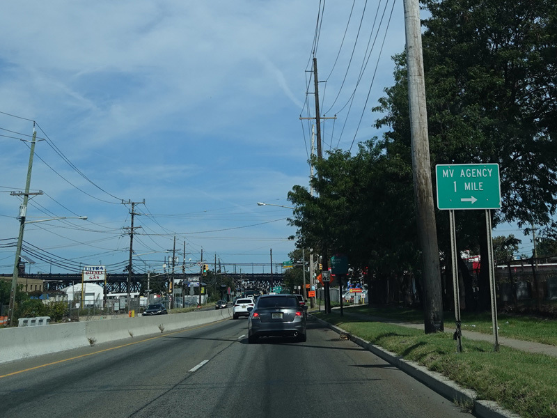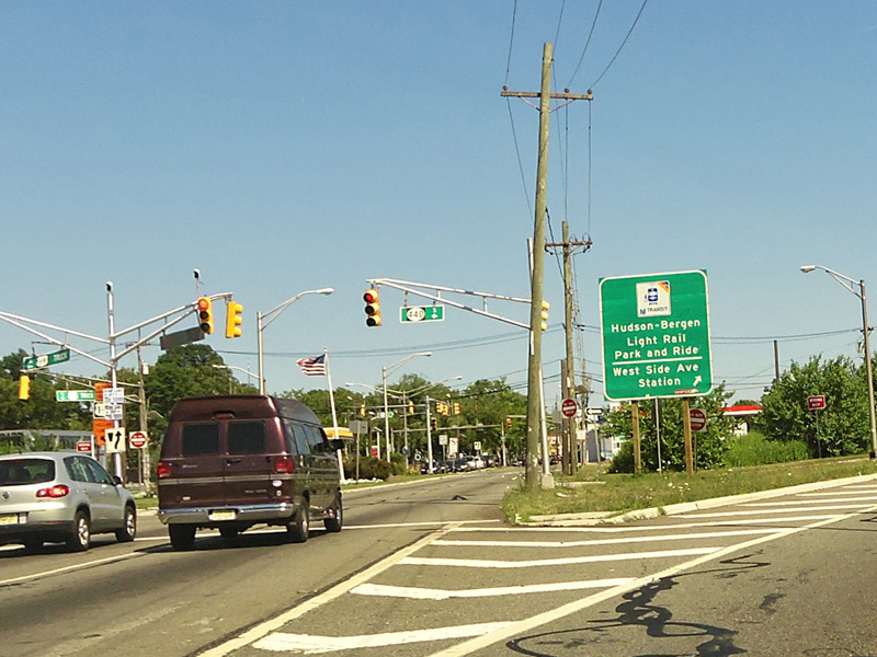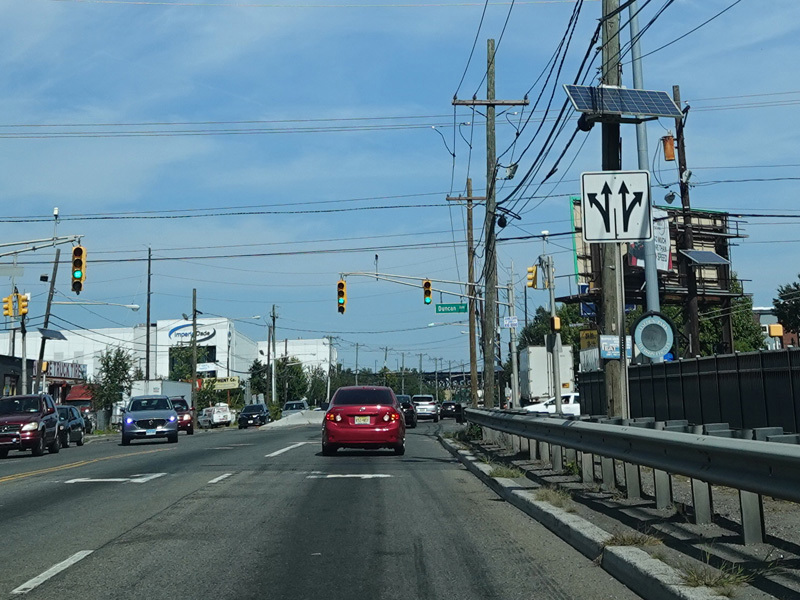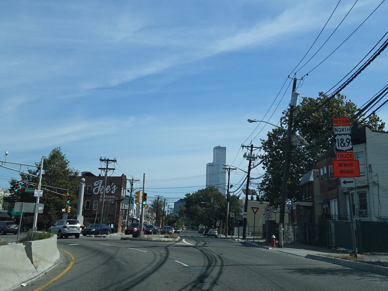 Truck US 1/US 9 runs north through Jersey City as a four-lane divided road. There are traffic lights at Duncan Avenue and Halleck Avenue.