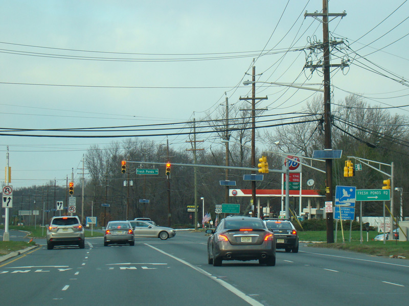 CR 522 splits off to the left at a traffic lights. Fresh Ponds Road is to the right.