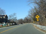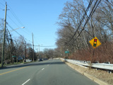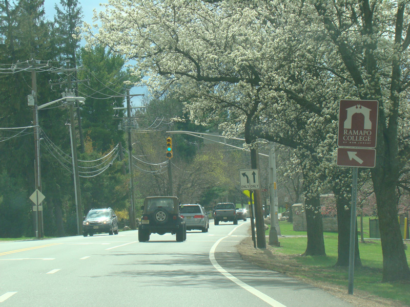 Ramapo Valley Road runs south as a two-lane undivided road. There is a traffic light at Ramapo College of New Jersey.