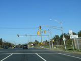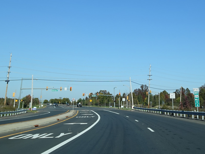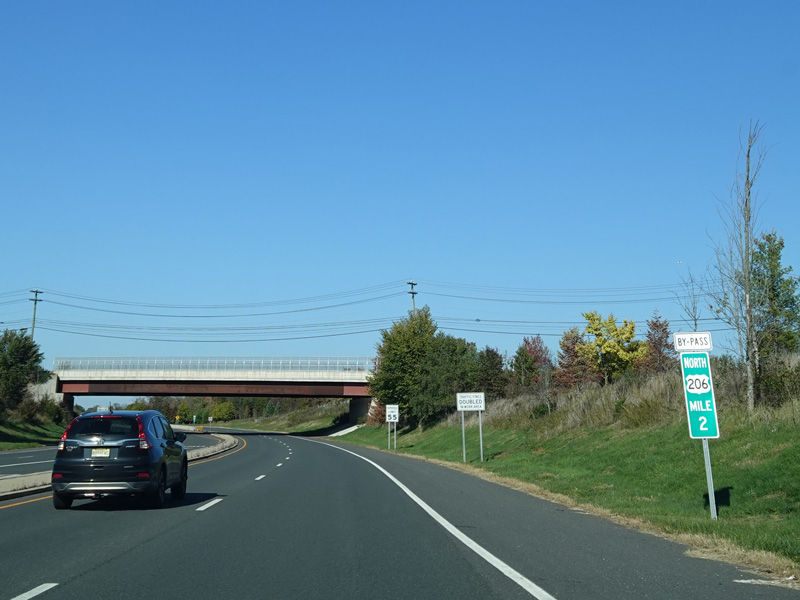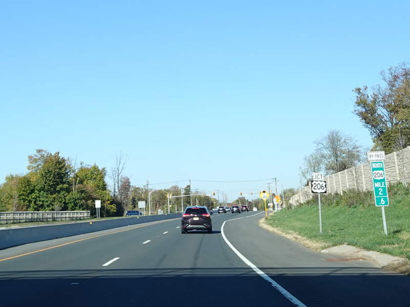 The Hillsborough Bypass ends at a traffic light with jughandles at the mainline of US 206. Continue straight ahead to go north.