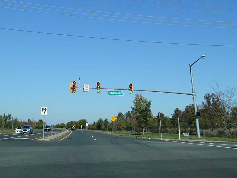 The Hillsborough Bypass begins at the mainline of US 206 and runs north as a two-lane divided highway. There is a traffic light at Hillsborough Road.