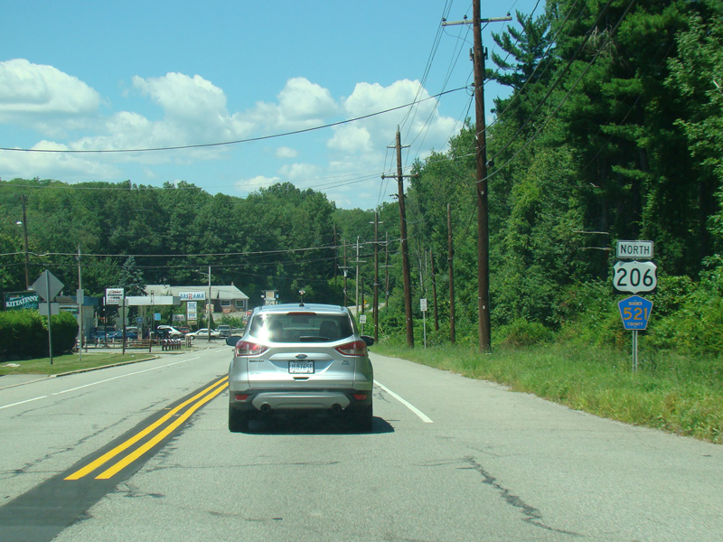 US 206 and CR 521 split here. Bear left to stay on US 206. Bear right for CR 521. Make a hard right turn for Deckertown Turnpike (CR 650), which begins here.