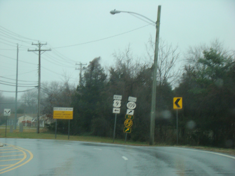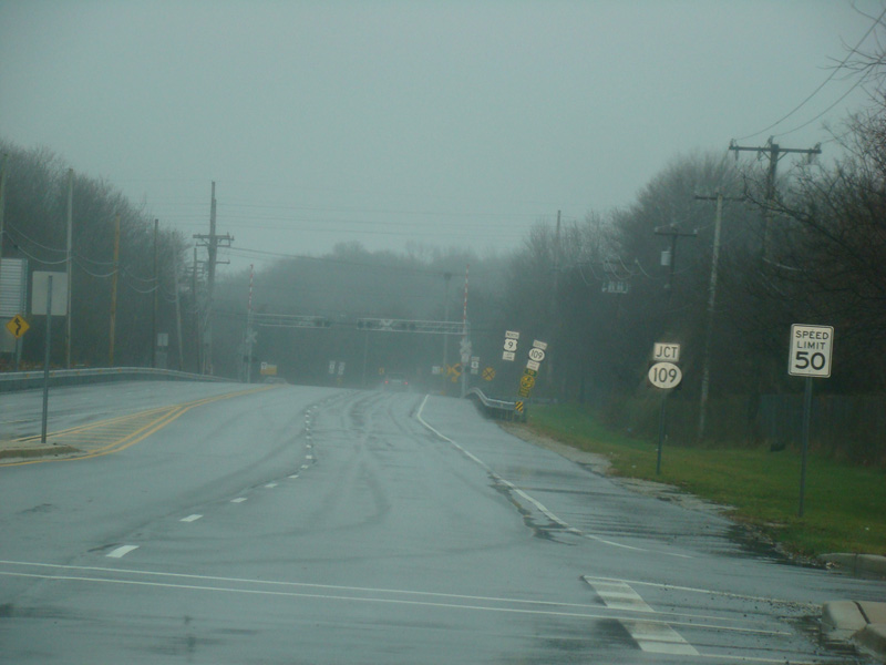 There is a railroad crossing, and then the roadway splits. Bear left to continue north on US 9. Bear right for NJ 109, which provides access to the Garden State Parkway (NJ 444).