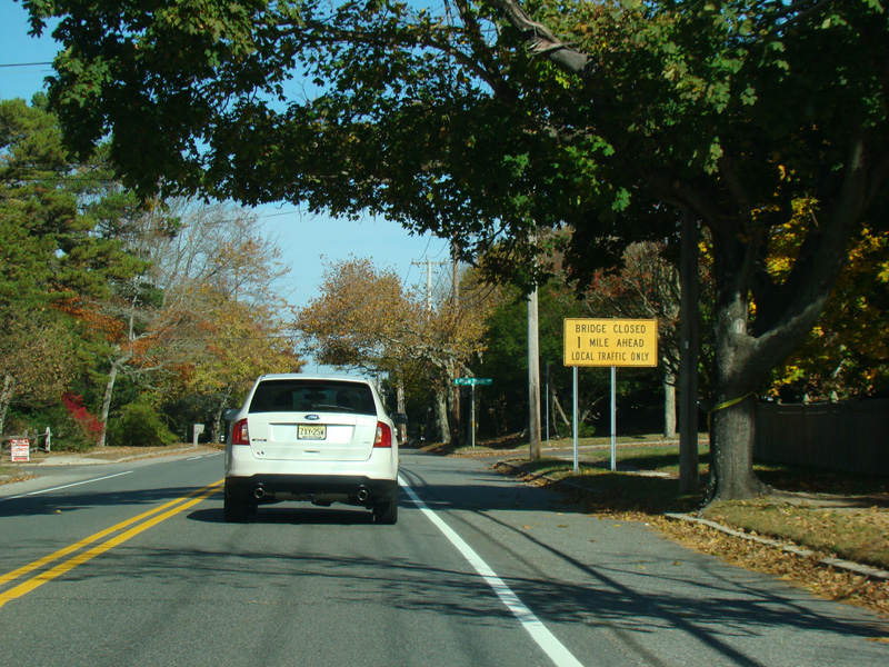 The road ends at the Beesleys Point Bridge, which is currently out of commission. Motorists wishing to continue north must backtrack to Roosevelt Boulevard (CR 623) and take the parkway north for one exit.