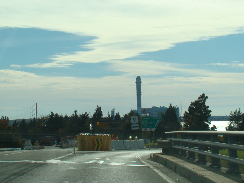 Skipping south to Somers Point, there is an interchange with the Garden State Parkway (NJ 444). Straight ahead, US 9 is routed across the Beesleys Point Bridge, which is currently closed due to construction. Motorists wishing to reach the portion of US 9 south of the bridge must detour via the parkway.