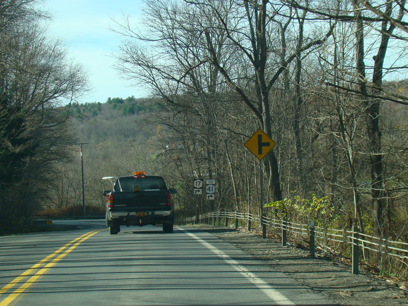 NY 41 begins on the right. Turn right here for another interchange with the Quickway (NY 17/Future I-86).