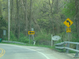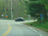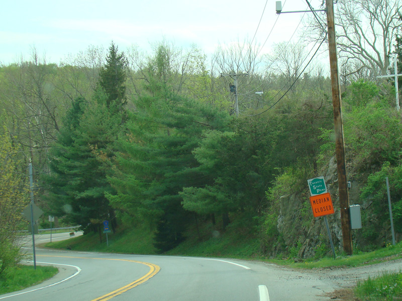 Carpenter Road crosses the Taconic Parkway at an at-grade intersection with a flasher and a stop sign. While it was once possible to drive across the parkway, the median is now closed except for emergency vehicles. All other vehicles must either turn right or turn around here.