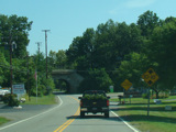 Van Wagner Road narrows down to one lane for a railroad underpass. CR 38 ends here. Van Wanger Road continues straight ahead as a local street.