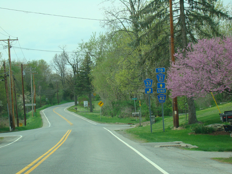 CR 42 ends here at CR 33. Turn left onto Hillside Lake Road to go east. Continue straight ahead on Arthursburg Road to go west.