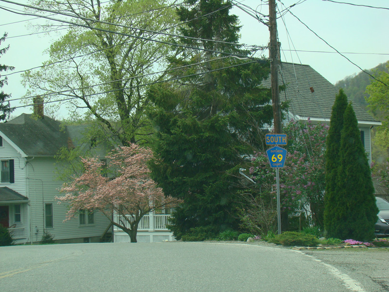 After two blocks, CR 69 splits off from NY 55 and runs south as Harmony Road. It eventually reaches the border with Putnam County, where it becomes Putnam CR 63.