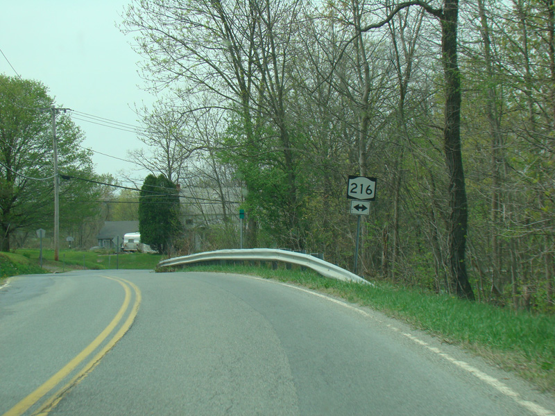 There is a stop sign at NY 216. Turn right to go east or left to go west. To stay on Greenhaven Road, turn right and then immediately left.