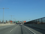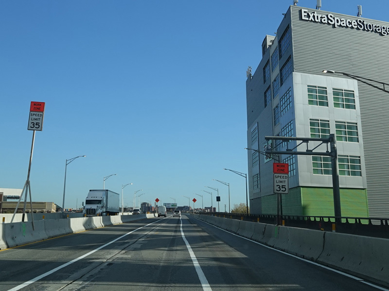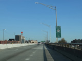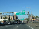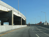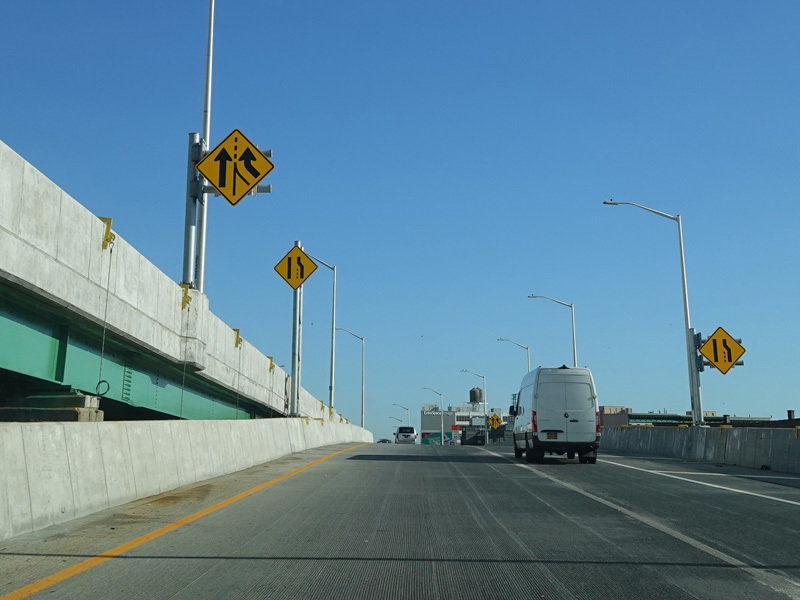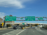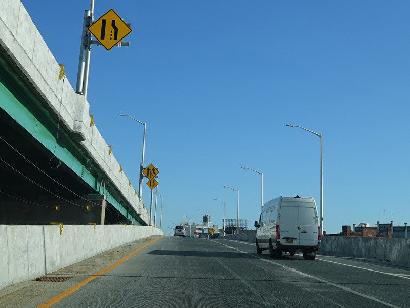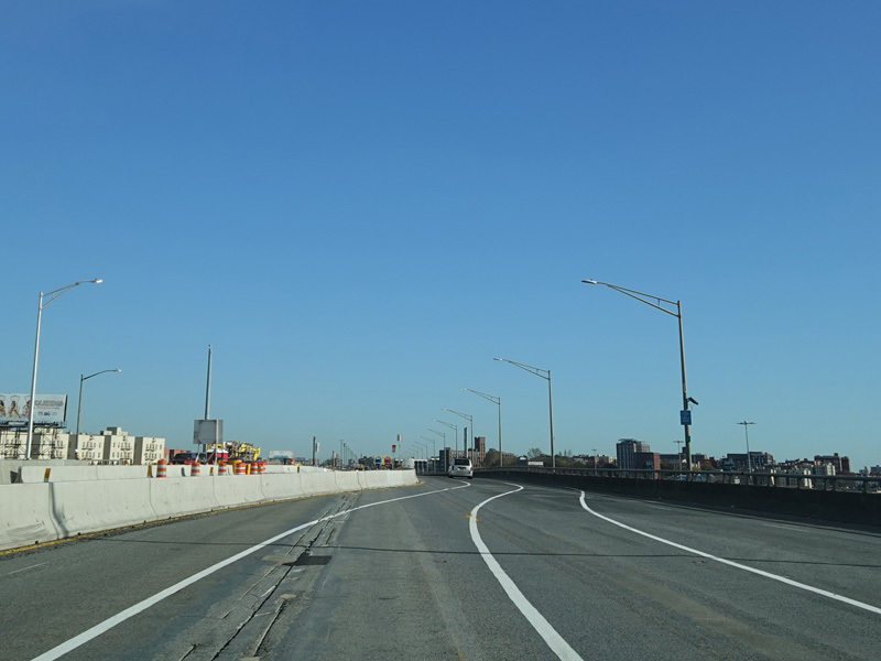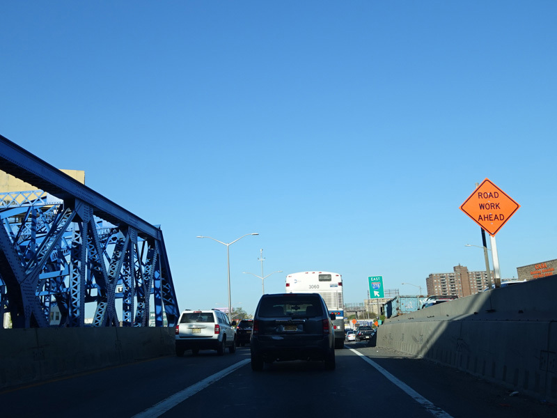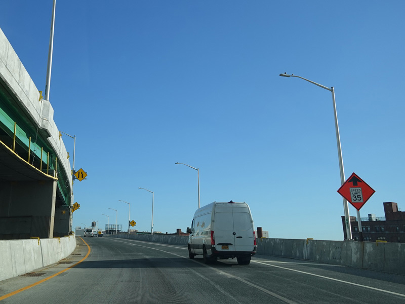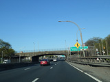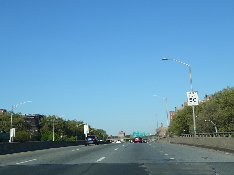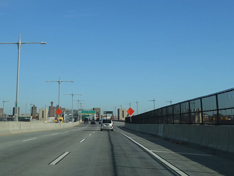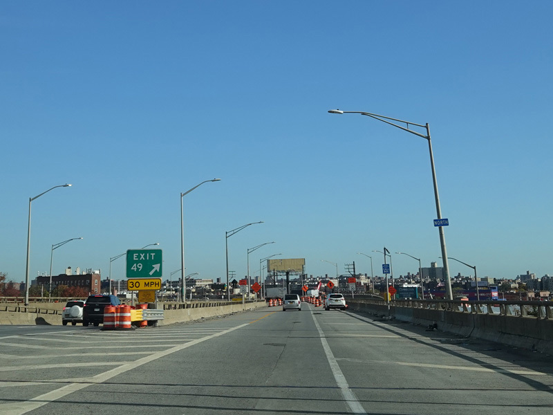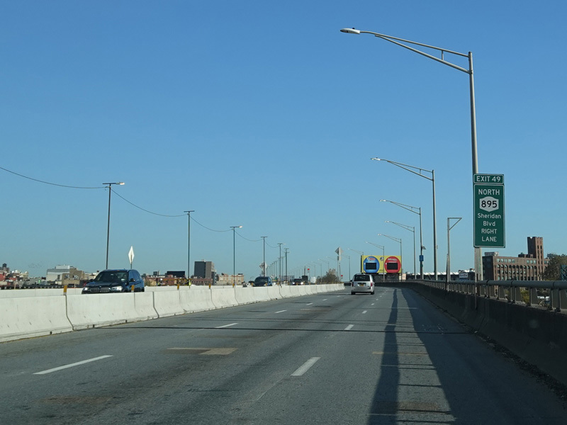 The lanes from the RFK Bridge merge with lanes from the Major Deegan Expressway (I-87) to form the Bruckner Expressway. Exit 49 is for Sheridan Boulevard (NY 895).