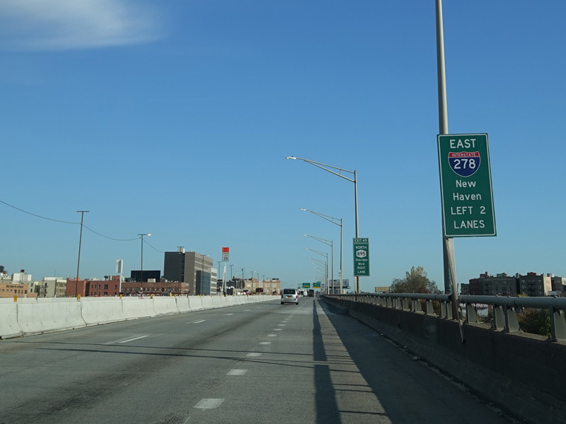 There is a bridge from Randalls Island to the Bronx. On the other side of the bridge, exit 47 is for the Major Deegan Expressway (I-87). It is a left exit. Bear right to stay on I-278, which is known as the Bruckner Expressway from this point on. Exit 48 is for East 138 Street.