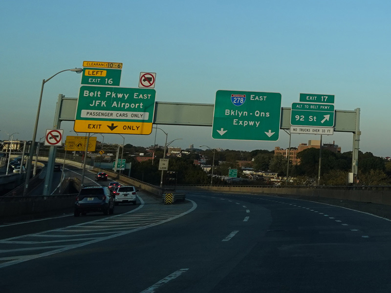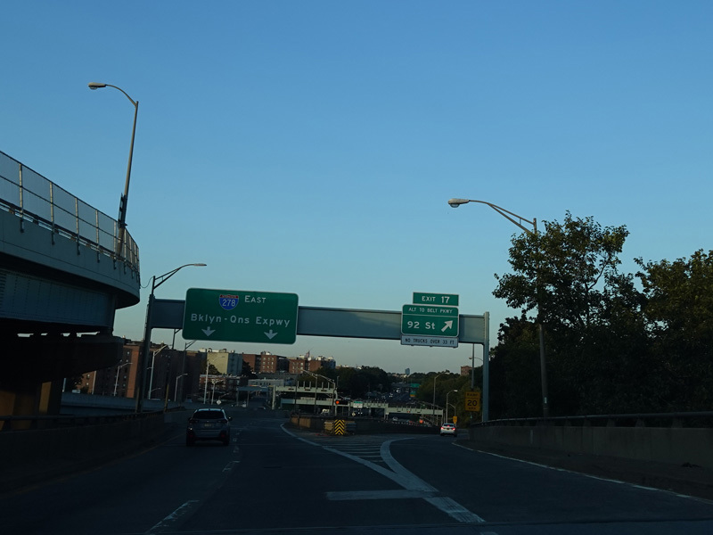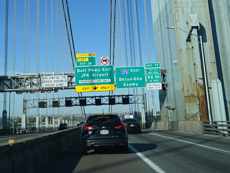 The Verrazano Bridge is a suspension bridge across the Narrows to Brooklyn. There are two exits at the end of the bridge. Exit 16 is for the Belt Parkway east. It is a left exit. Exit 17 is for 92 Street.