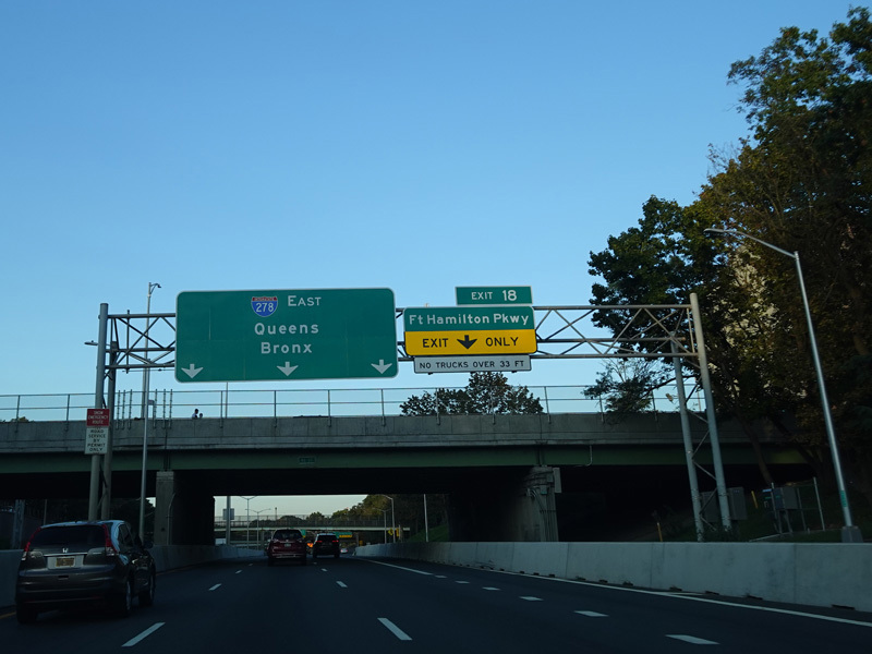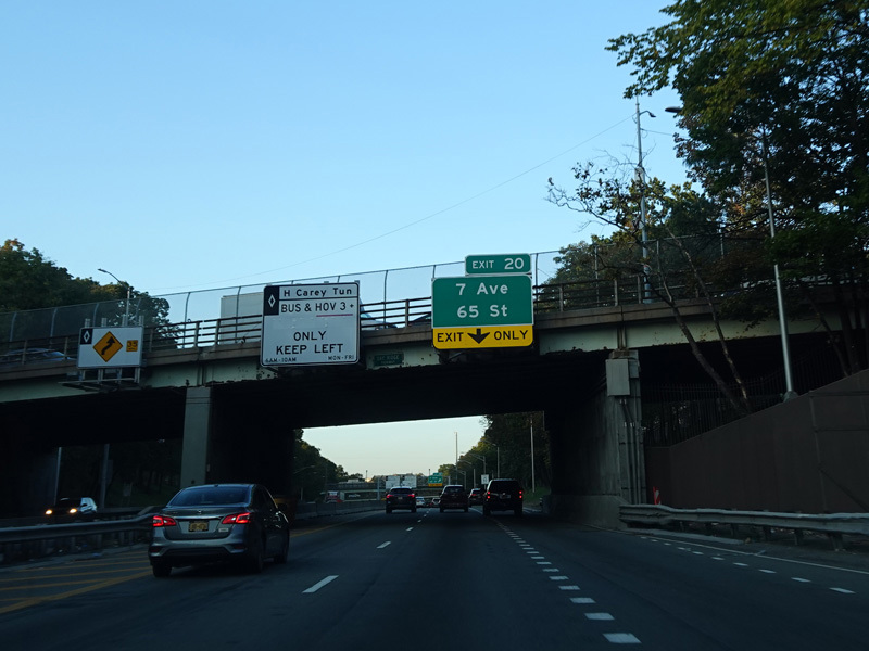 Welcome to the Brooklyn-Queens Expressway! An HOV lane begins here and extends to the Hugh L. Carey Tunnel. Exit 18 is for Fort Hamilton Parkway.