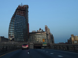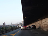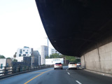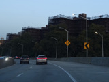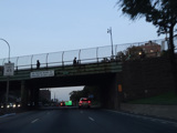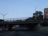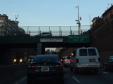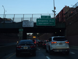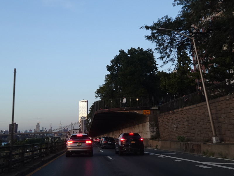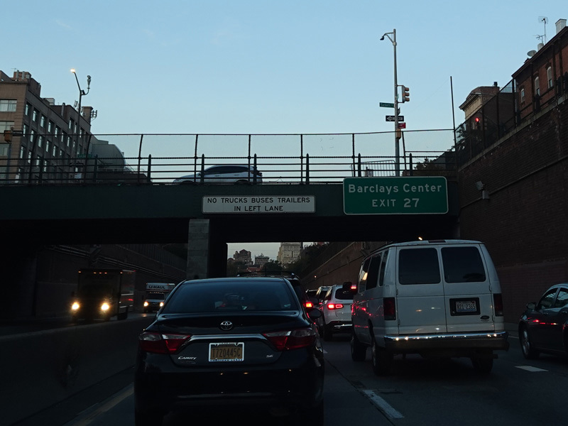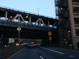 The expressway goes under the Brooklyn Heights Promenade. The Brooklyn Bridge is visible in the distance.