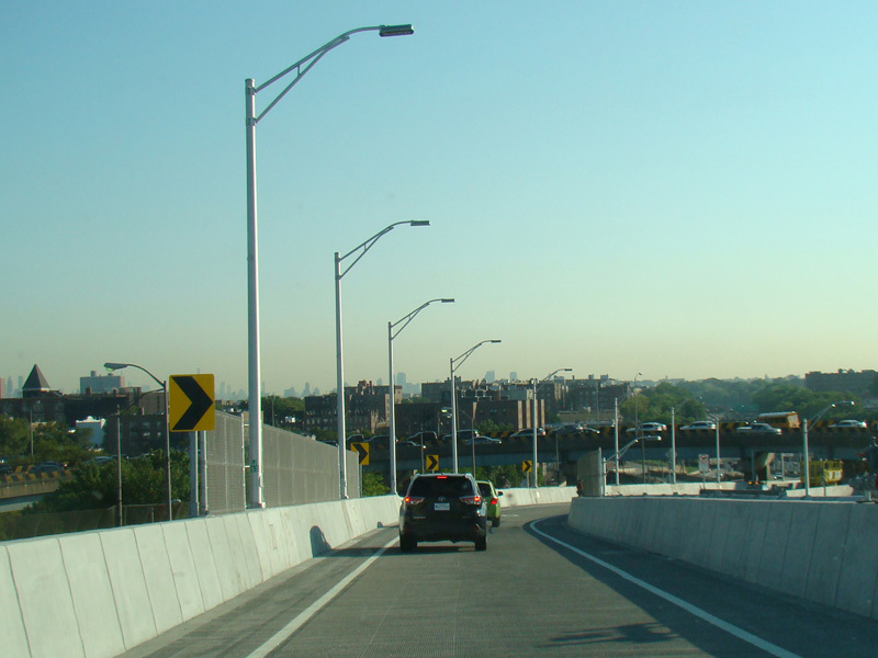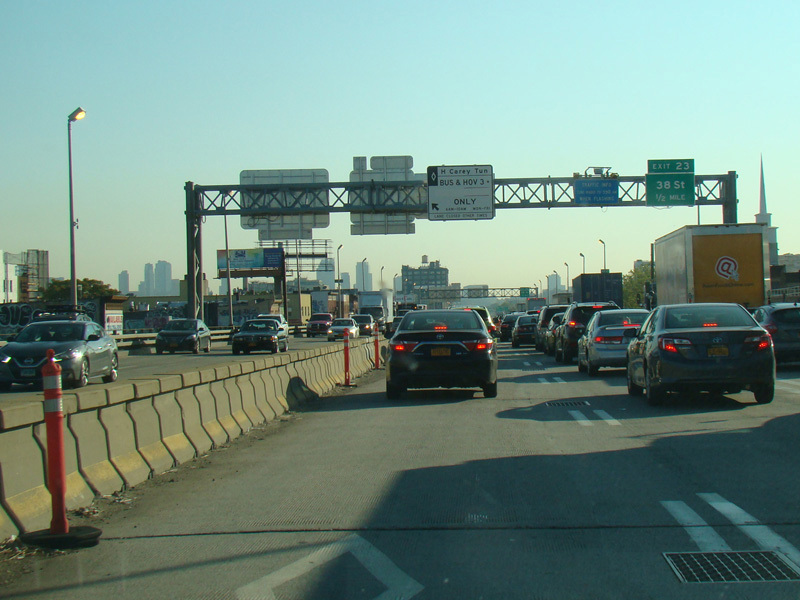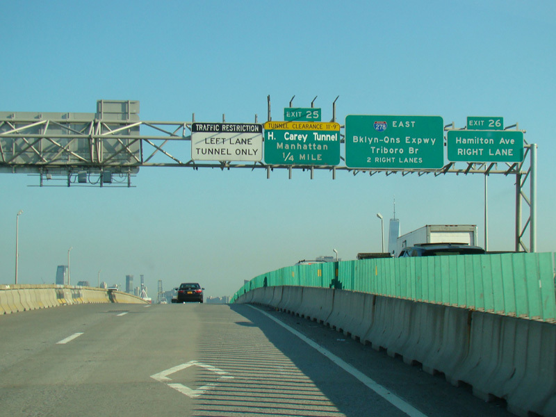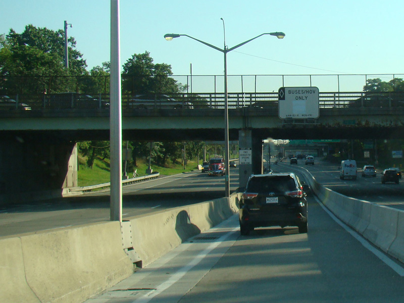 The middle lane on the Brooklyn-Queens Expressway between the Verrazano Bridge and the Hugh L. Carey Tunnel (I-478) is a reversible HOV lane that can be used by buses and carpools of at least three people travelling between Staten Island and Manhattan to bypass rush hour traffic.