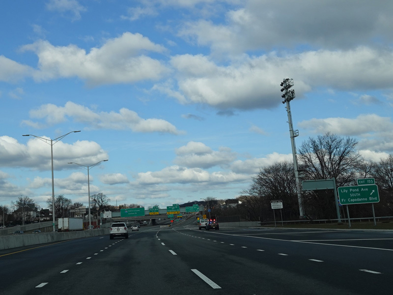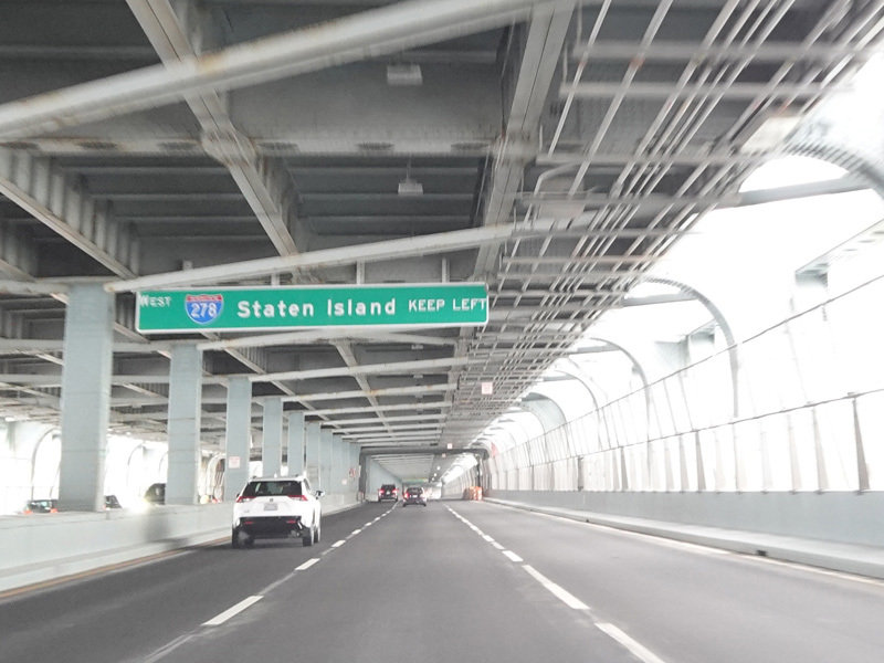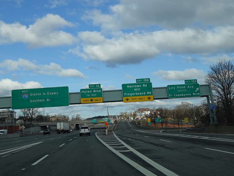 On the other side of the bridge, there is a cashless tolling gantry. There are two exits on the right. Exit 15N is for Bay Street. Exits 15S is for Lily Pond Avenue south and Father Capodanno Boulevard. Continue straight ahead for exit 15W for Narrows Road west and Fingerboard Road. Use the entrance ramp on the left to get on the Staten Island Expressway.
