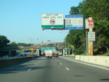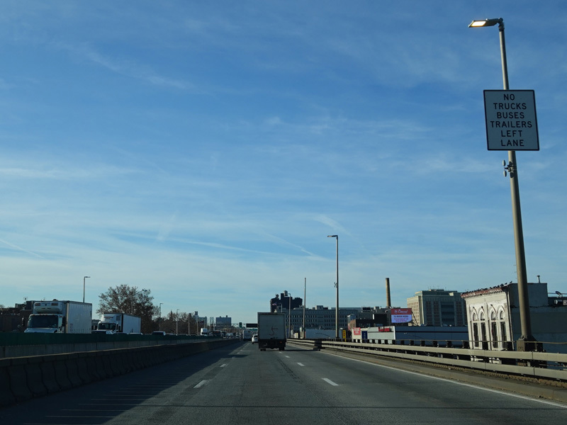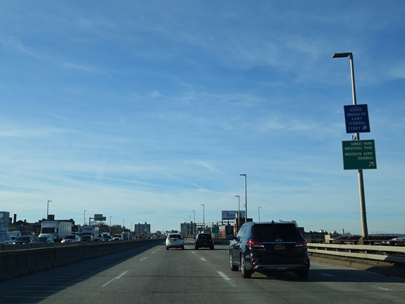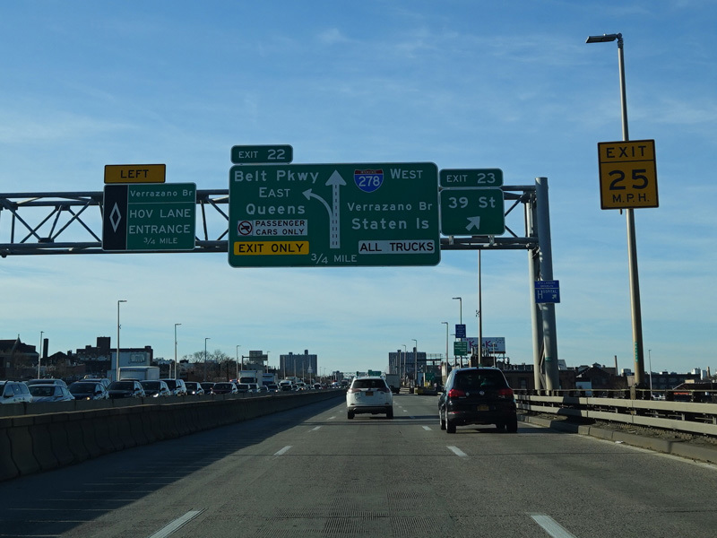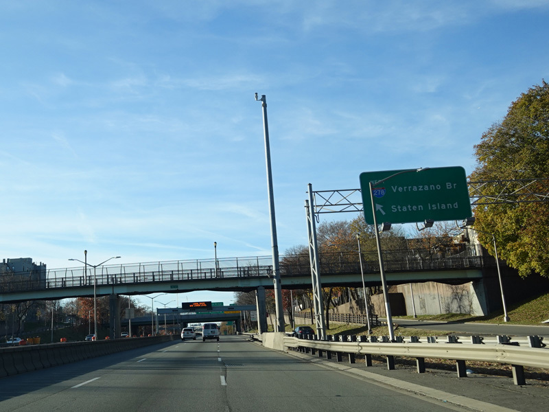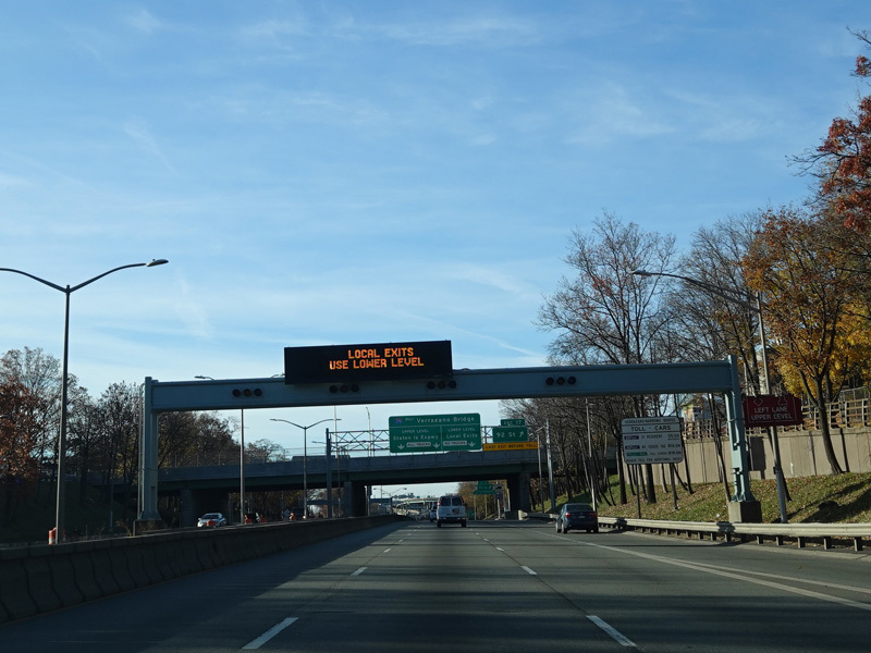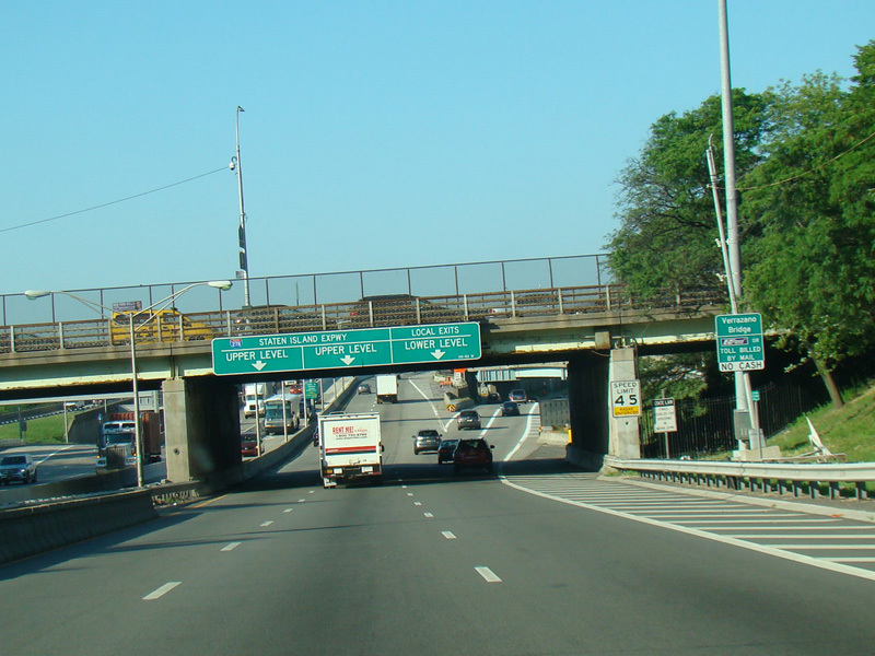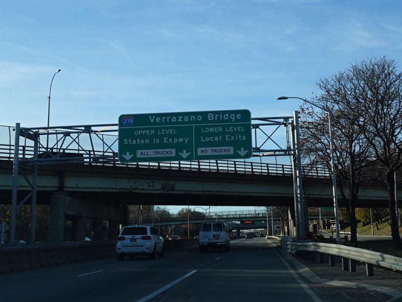 Just before the Verrazano Bridge, the roadway splits. Bear right for the lower level of the bridge. Bear left for the upper level. All trucks must use the upper level.