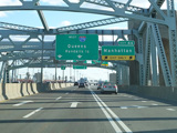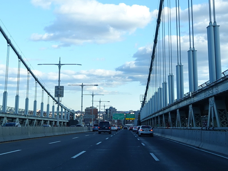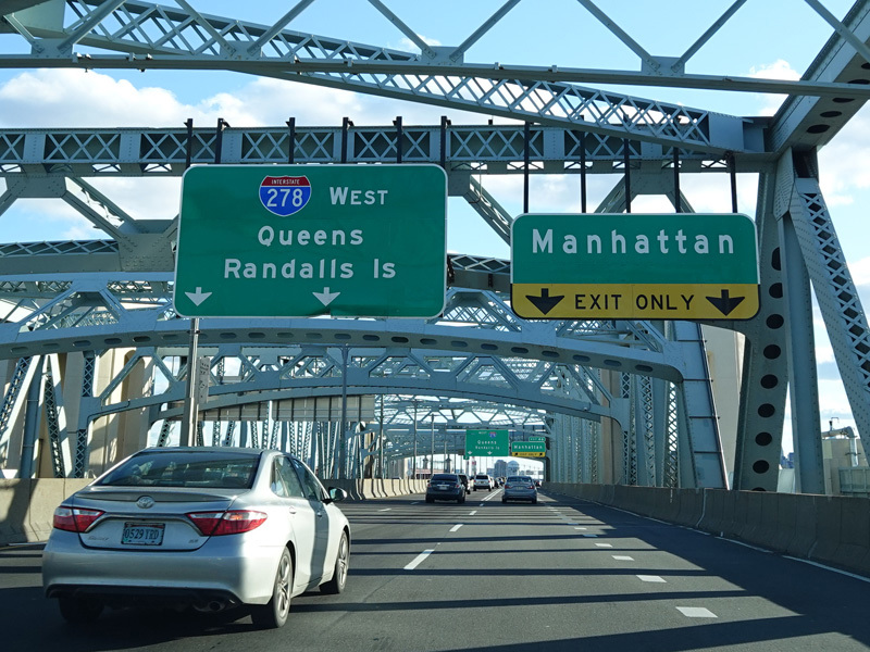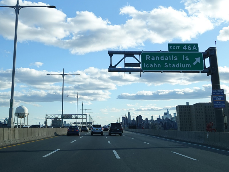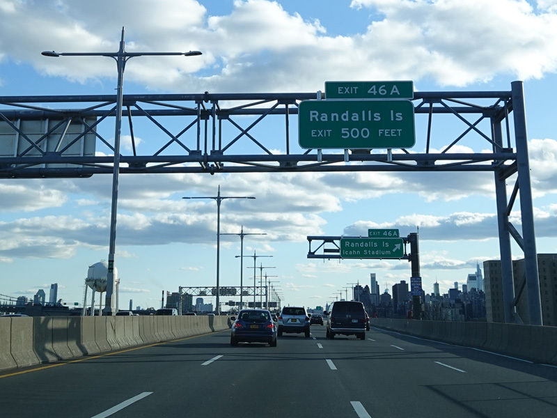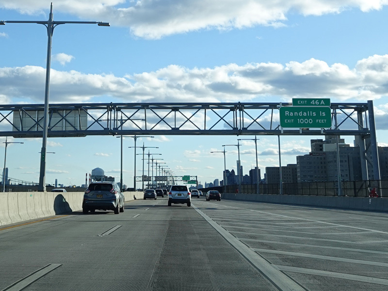 The RFK Bridge has three legs, the first of which connects the Bronx to Randalls Island. Exit 46 is for Manhattan. Of the two remaining legs of the RFK Bridge, one is accessed through this exit and the other is straight ahead. Exit here for the FDR Drive, the Harlem River Drive, 2 Avenue, and East 125 Street in Manhattan.