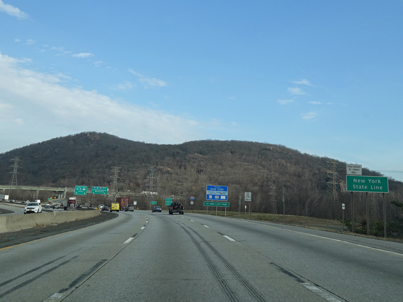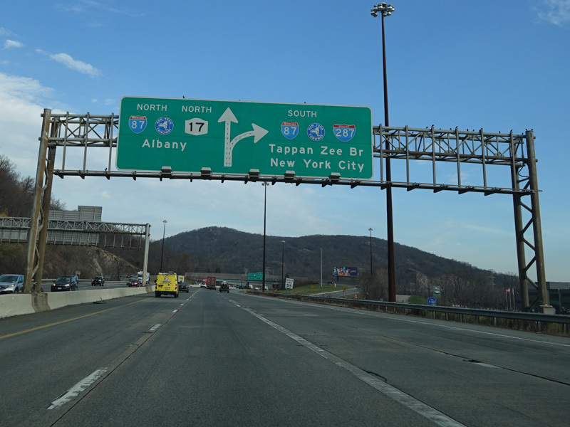 Welcome to New York, Rockland County, the Town of Ramapo, and the Village of Suffern! I-287 enters the state multiplexed with NJ 17, which becomes NY 17 at the state line. The roadway splits. Bear right to stay on I-287, which is multiplexed with I-87 along the New York Thruway south. Bear right for to stay for the Thruway north and NY 17 north.
