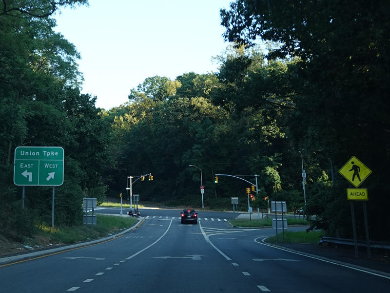 The ramp for exit 2 when travelling south also splits. Bear left to go west on Union Turnpike. Bear right to go west.