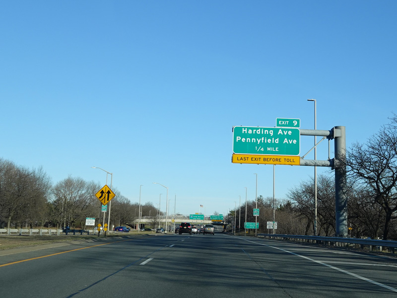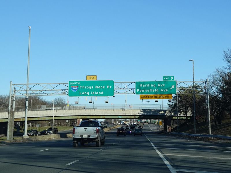 The Throgs Neck Expressway (I-695) merges in from the left. Exit 9 is for Harding Avenue and Pennyfield Avenue. It is the last exit in the Bronx. Immediately after it, there is a cashless tolling gantry.