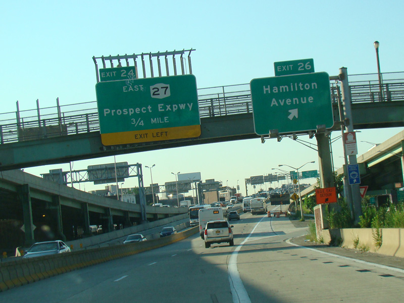 I-478 emerges from the tunnel in Brooklyn. There is an unnumbered exit for the Brooklyn-Queens Expressway (I-278) east and Atlantic Avenue. Straight ahead, I-478 ends and merges into the Brooklyn-Queens Expressway (I-278) west. There is access to exit 26 for Hamilton Avenue immediately before the merge.