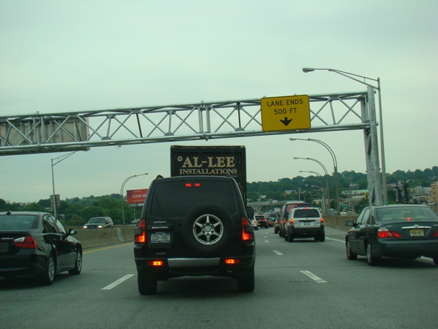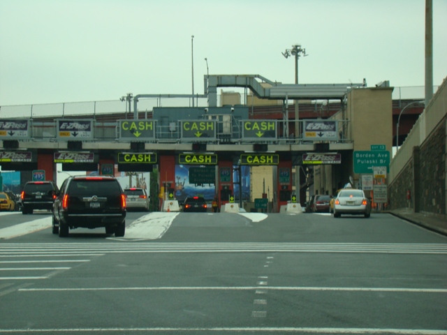 I-495 emerges from the tunnel in Queens. All vehicles must pay a toll. Exit 13 is for Borden Avenue and the Pulaski Bridge. It is a sharp right turn immediately after the toll.
