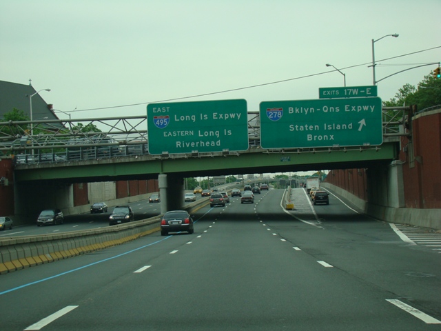 From this point east, I-495 is called the Long Island Expressway. Exits 17W-E are for the Brooklyn-Queens Expressway (I-278) and Maurice Avenue.