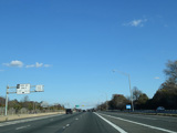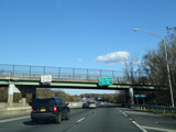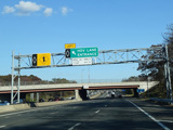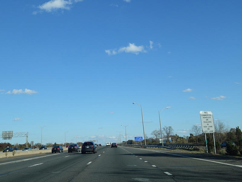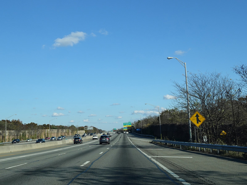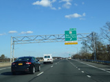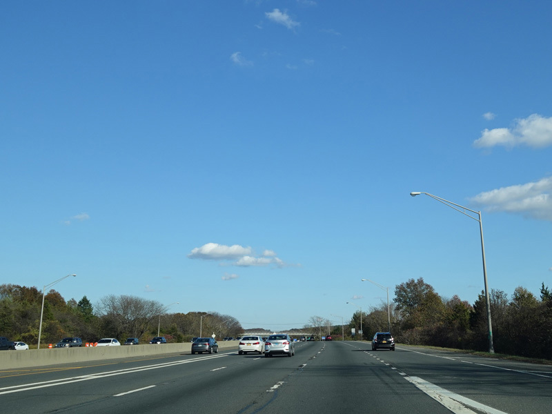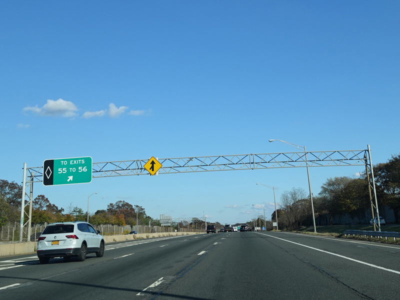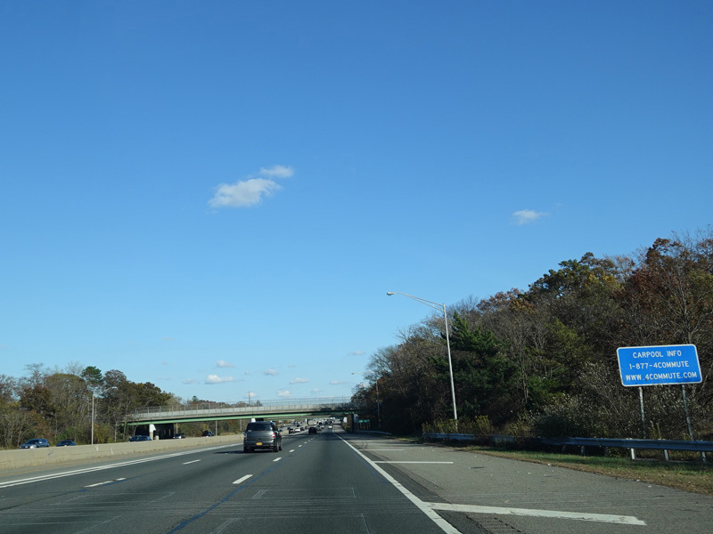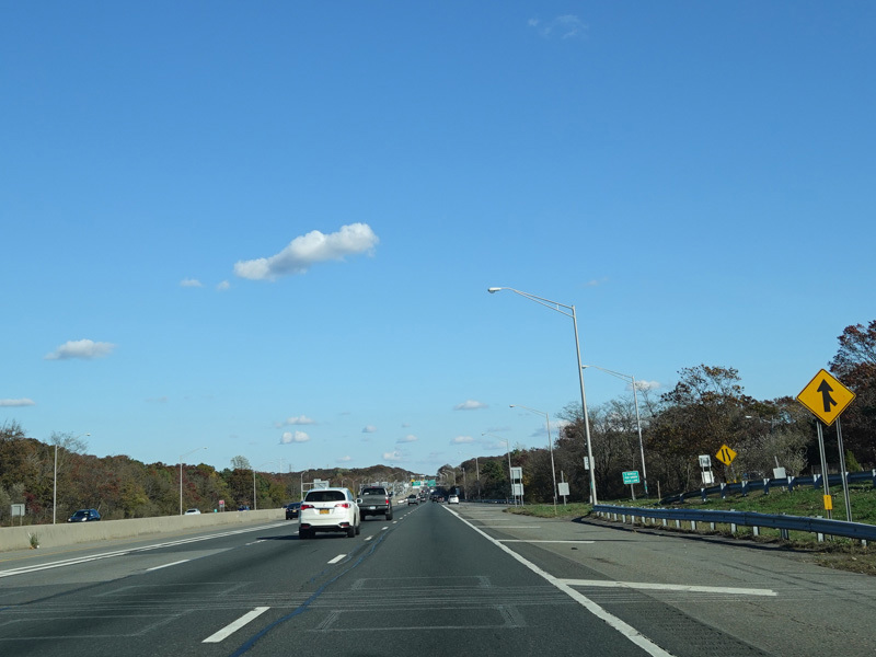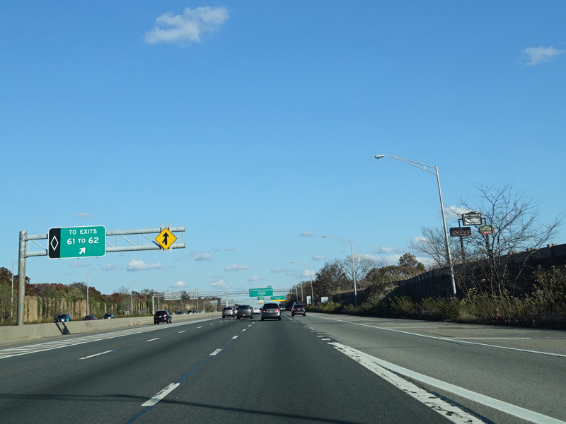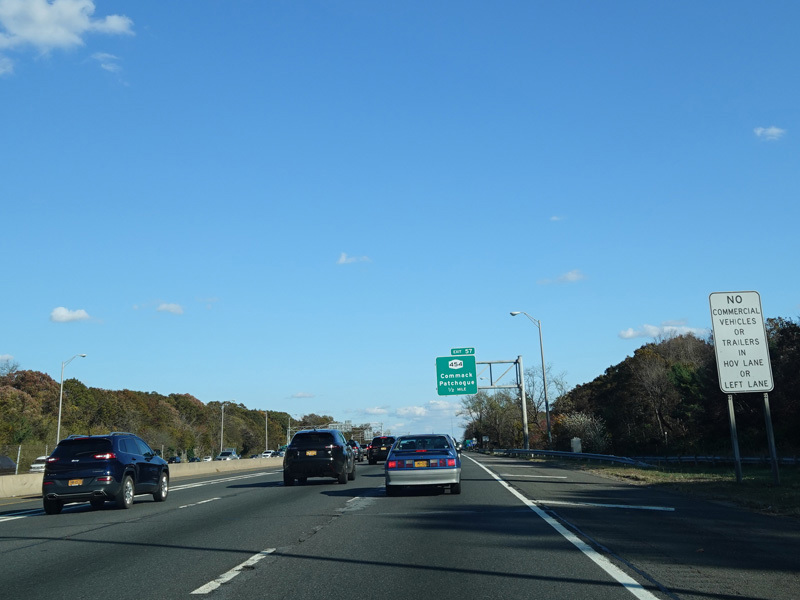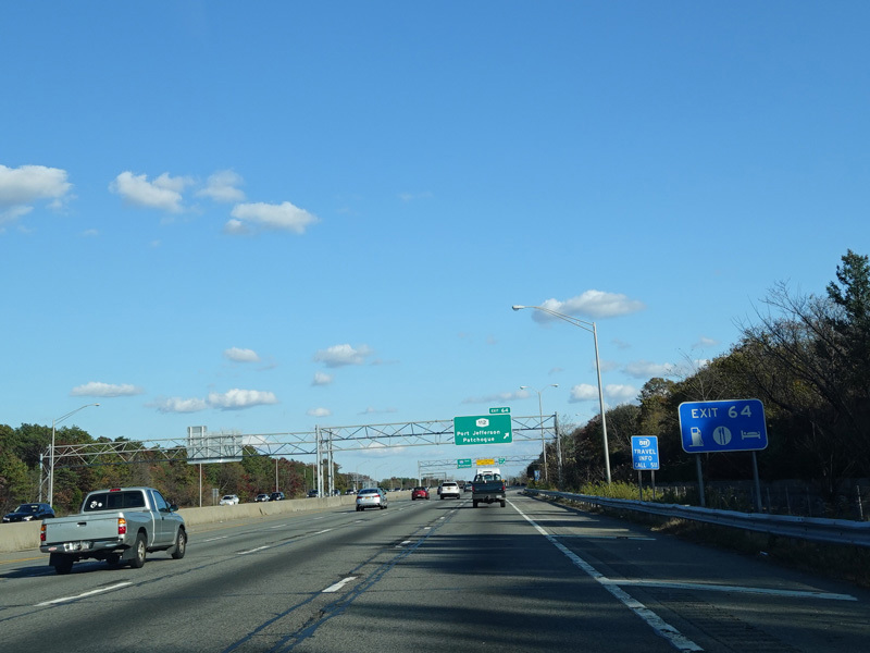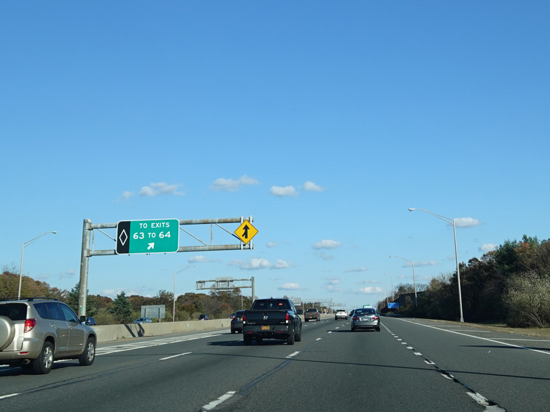Exit 64 is for NY 112. The HOV lane ends here and the expressway has three lanes in each direction from here until its eastern terminus.