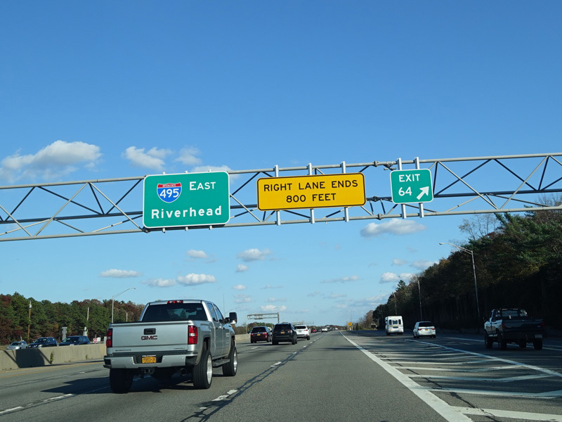 The expressway is about to end. Signs direct motorists bound for Riverhead and the east end on which of the last three exits to use.