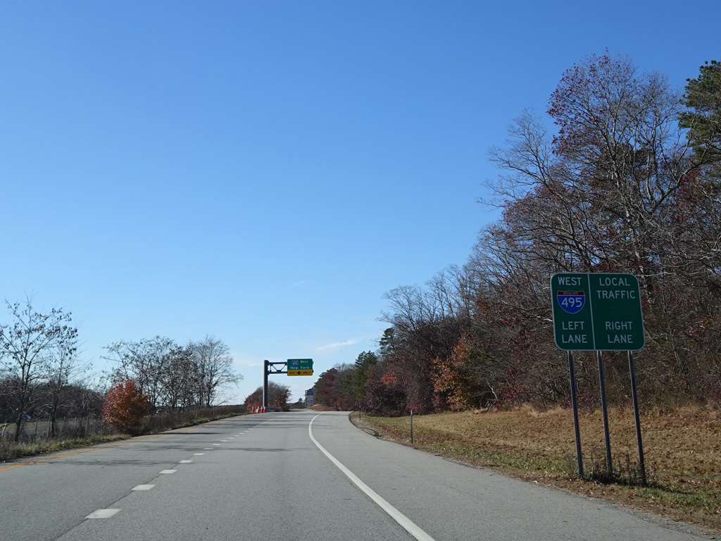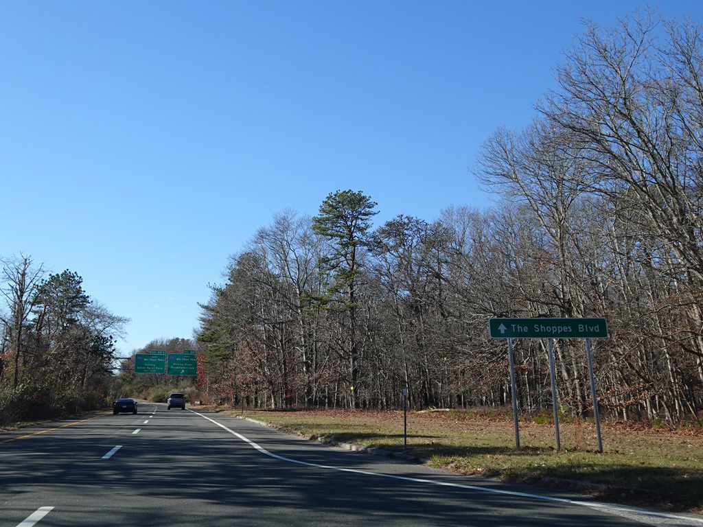 The ramp for exit 68 when travelling west was also constructed to be part of an unbuilt extension of the service road. There is a pair of exits for the William Floyd Parkway (CR 46), followed by an entrances back onto the expressway. The signage on the ramp in this direction makes reference to exits 68N-S, even though the signage on the expressway itself treats this as a single exit 68. Continue straight ahead for access to The Shoppes Boulevard.
