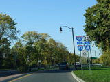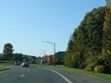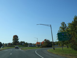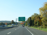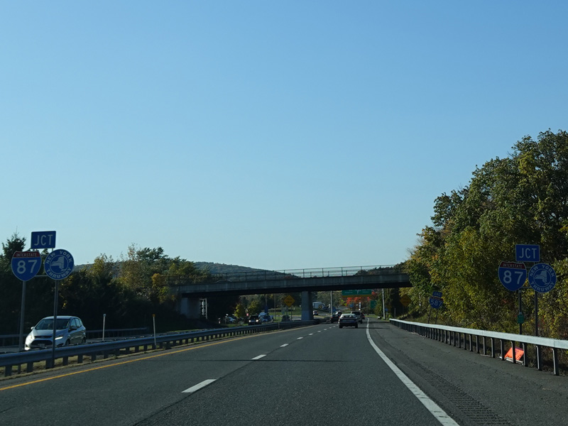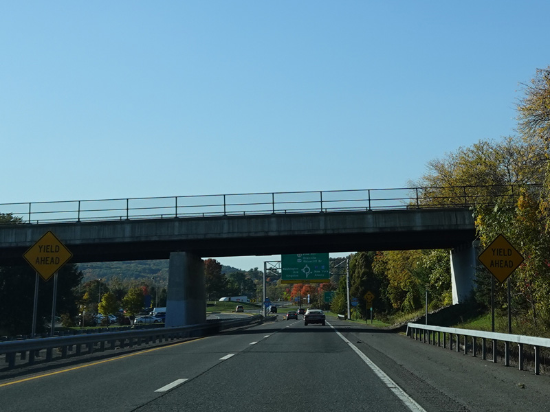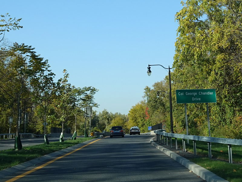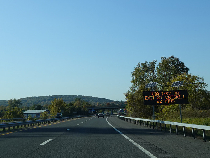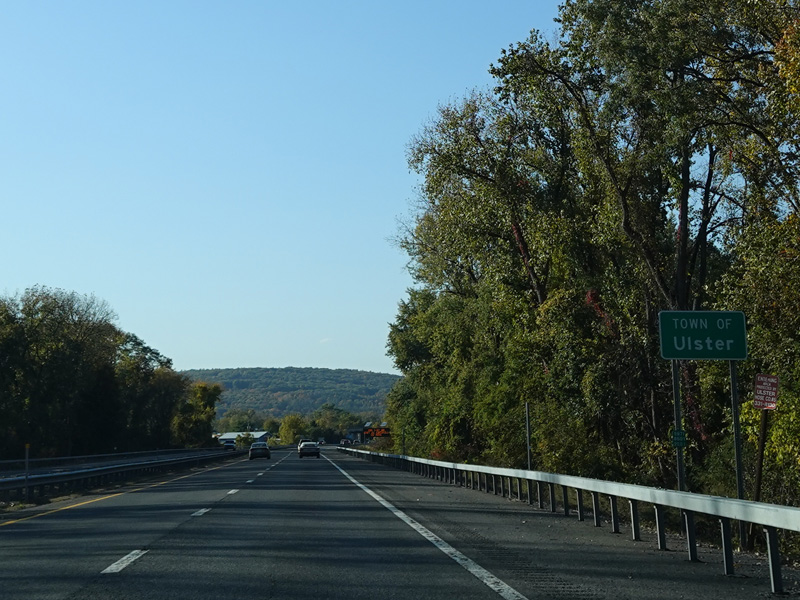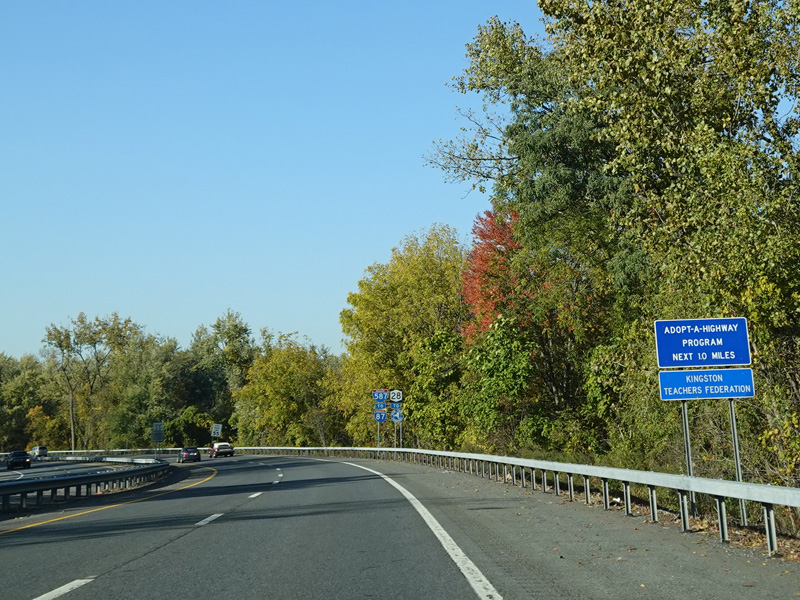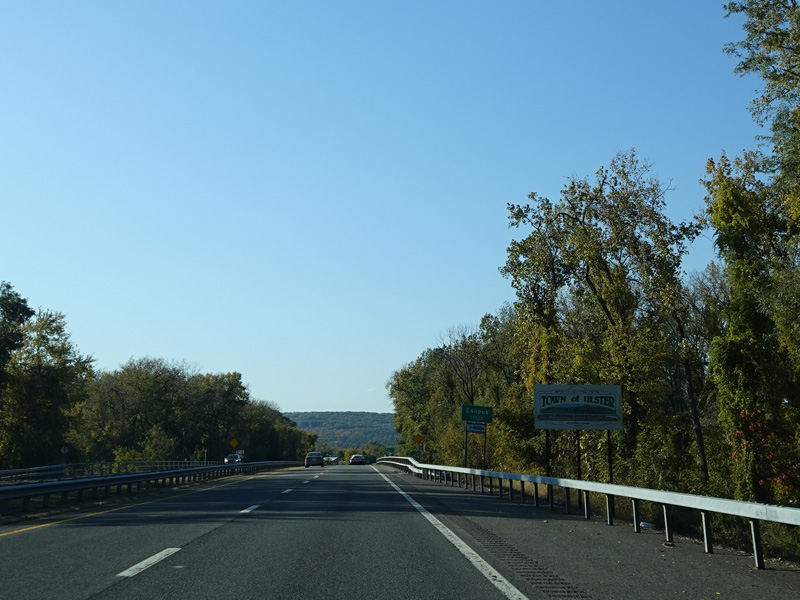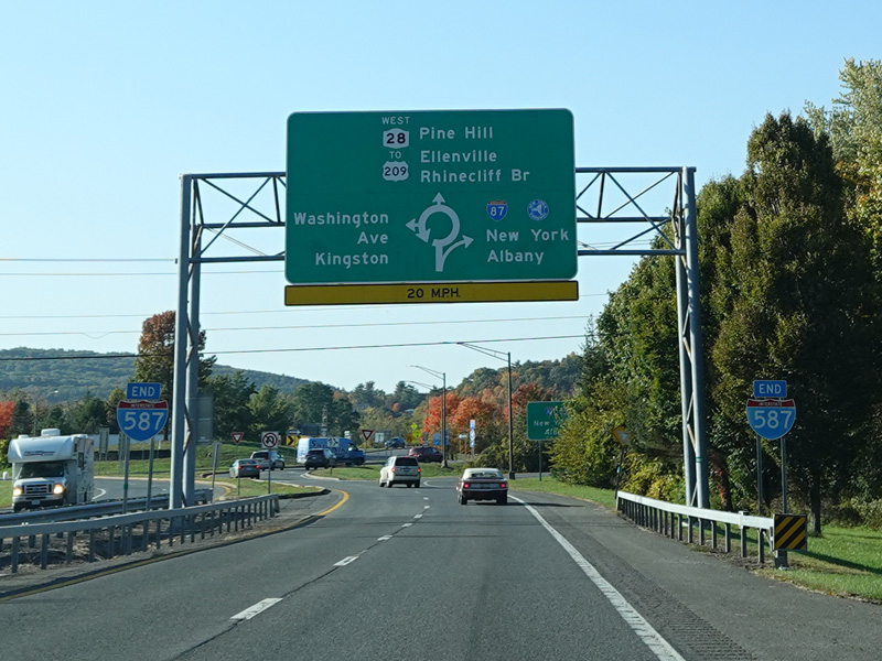 Colonel Chandler Drive ends here at a roundabout at the ramp for exit 19 of the New York Thruway (I-87). Continue straight ahead onto Onteora Trail to stay on NY 28, which has an interchange with US 209 just past here. Washington Avenue begins on the left.