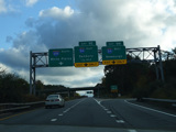 Exit 1 is for the Hutchinson Parkway south. It is a left exit. I-684 ends ahead at the Cross Westchester Expressway (I-287). Use the right lane to go west or the center lane to go east.