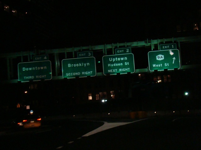 I-78 emerges from the Holland Tunnel and ends. There are five exits at the eastern terminus. Exit 1 is for West Street (NY 9A). Exit 2 is for Uptown Manhattan and Hudson Street. Exit 3 is for Brooklyn. Exit 4 is for Downtown Manhattan. Exit 5 is for Canal Street east.