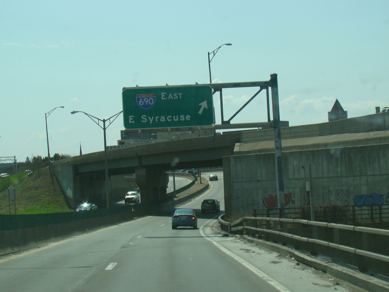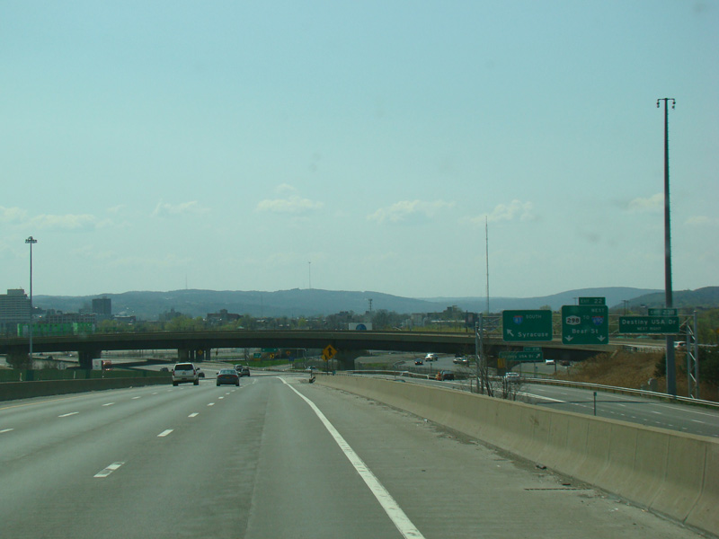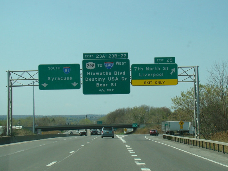 Exit 23A is for Hiawatha Boulevard. Exit 23B is for Destiny USA Drive. Exit 22 is for Bear Street (NY 298) and I-690 west.