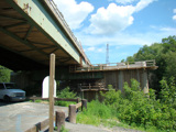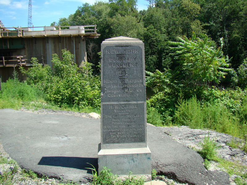 These pictures were taken from Carpenters Point, the peninsula formed where the Neversink River empties into the Delaware River. The bridge above carries I-84 over the rivers from New York to Pennsylvania. A stone marker gives the location of the border separating the tip of the peninsula, which is in New Jersey, from the remainder, which is in New York. The triple point where the borders of the three states come together is just feet west of here in the middle of the Delaware River.