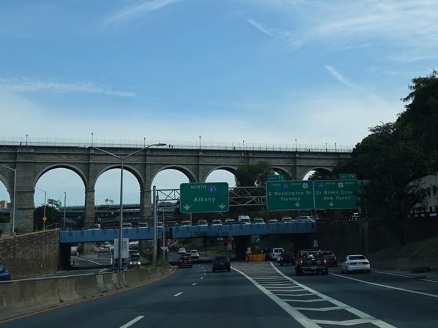 I-87 is a major north/south route in eastern New York. It begins at the Bruckner Expressway (I-278) in the Bronx, just north of the RFK Bridge. It runs north along the east side of the Harlem River as the Major Deegan Expressway. At the Bronx-Westchester county line, I-87 becomes the New York Thruway, New York's main toll highway and the longest toll highway in the country. The Thruway runs north through Westchester. In Elmsford, it curves to the west and merges with the Cross Westchester Expressway (I-287). The Thruway runs to the west, crossing the Hudson River on the Tappan Zee Bridge as I-87/I-287. In Suffern, I-287 leaves the Thruway and runs south into New Jersey. The Thruway continues north on the west side of the Hudson River to Albany. At exit 24 in Albany, the Thruway curves to the west and becomes I-90. I-87 leaves the Thruway and becomes the Northway. The Northway runs north through the Adirondack Mountains to the Canadian border. Unlike the Thruway, the Northway has no tolls.