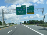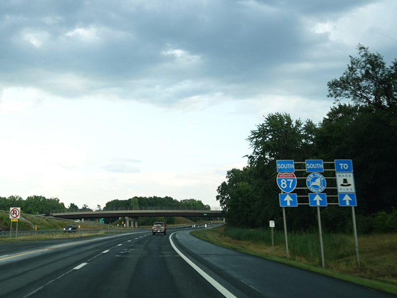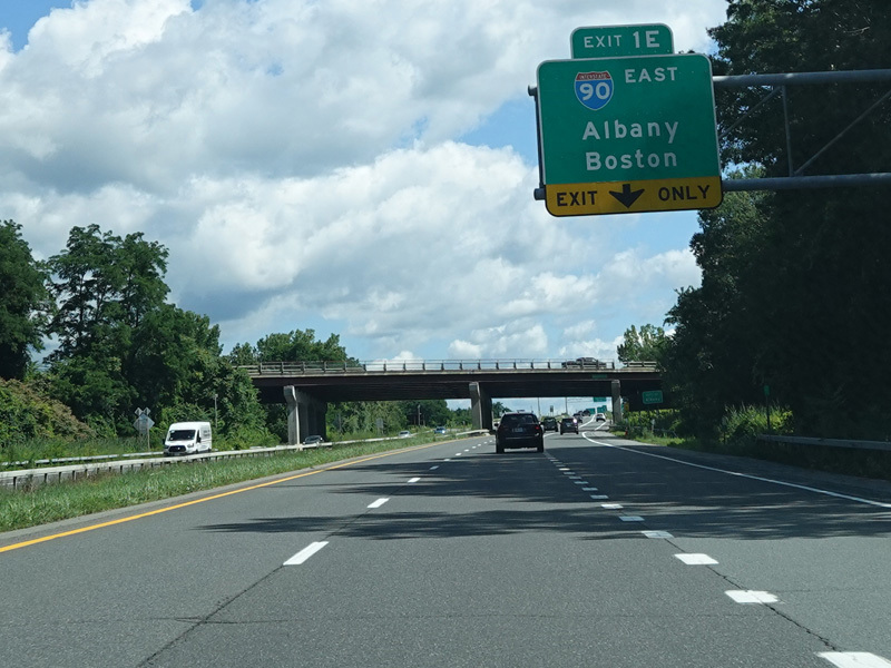 Entering the Northway from Western Avenue (US 20) leads to the same segment in the opposite direction. Exit 1E is for I-90 east. Exit 1W is for the New York Thruway (I-87/I-90). Straight ahead, the Northway continues as I-87 north.