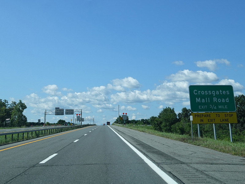 There is a short section of the Northway with no signed route number south of where I-87 splits off at exit 1W to follow the New York Thruway. After an exit for Crossgates Mall Road, it ends at a traffic light at Western Avenue (US 20). Turn left to go east or right to go west.