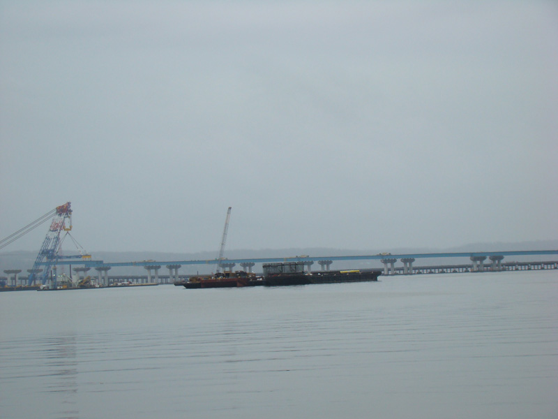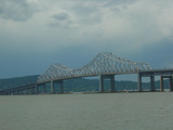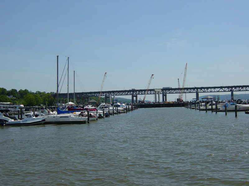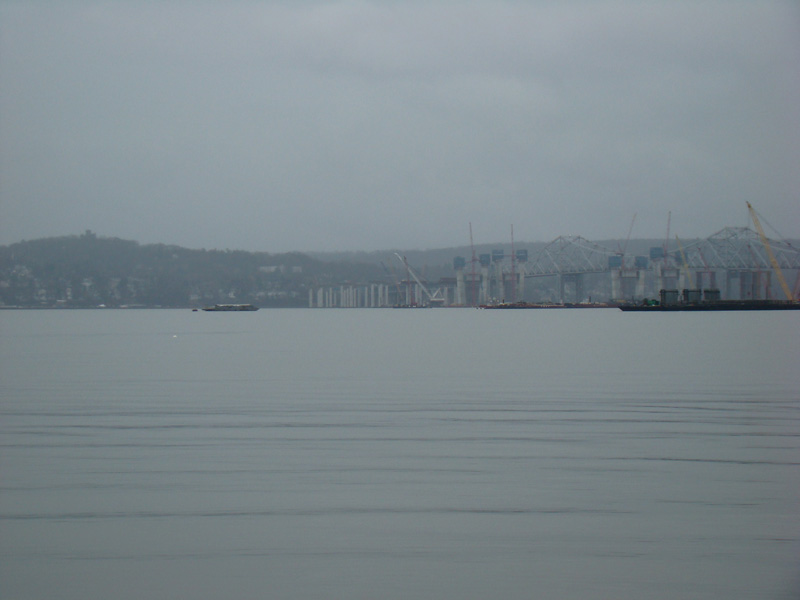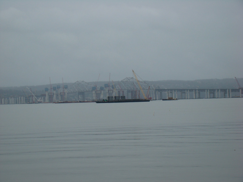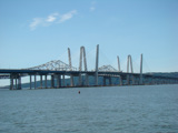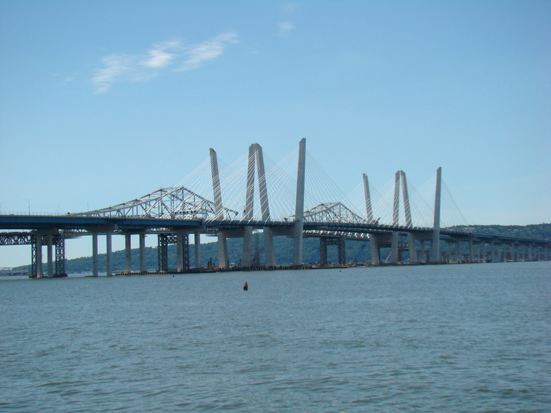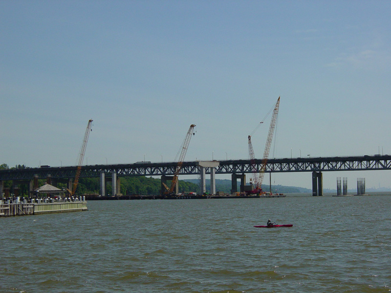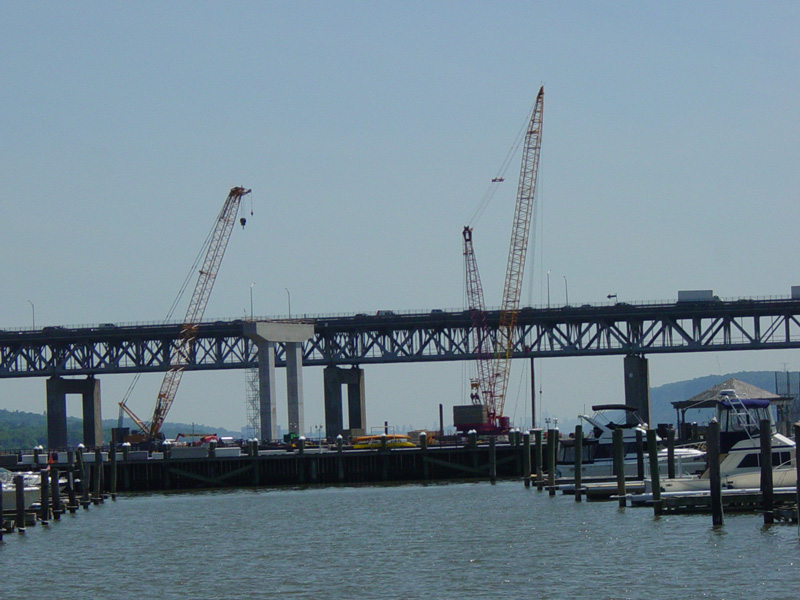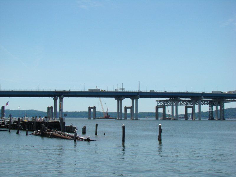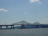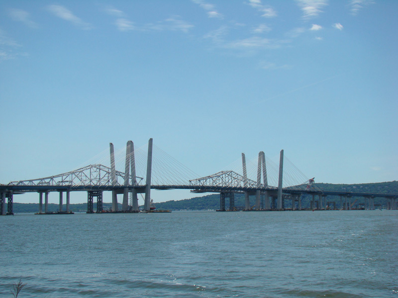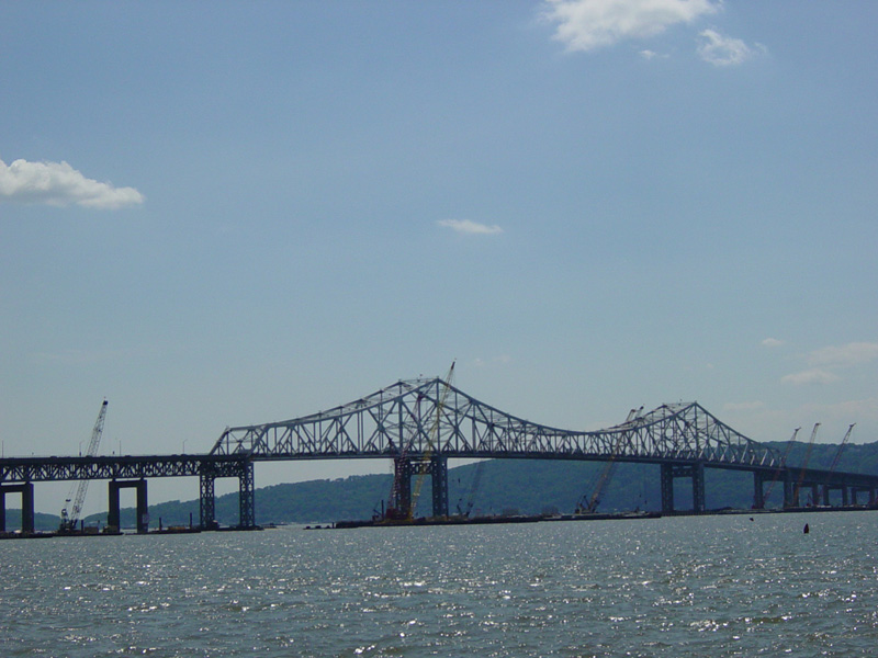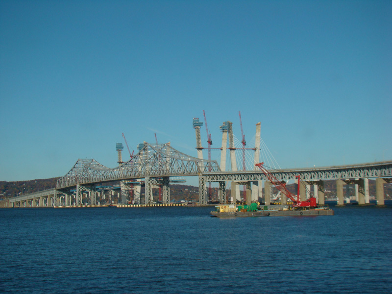 This picture of the Tappan Zee Bridge was taken from the Hudson Line of the Metro-North Railroad while construction was in progress. The original bridge is in the foreground, which the new bridge was being built behind it.