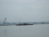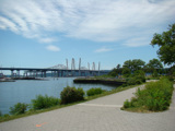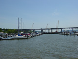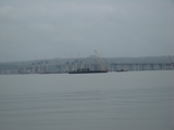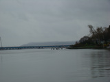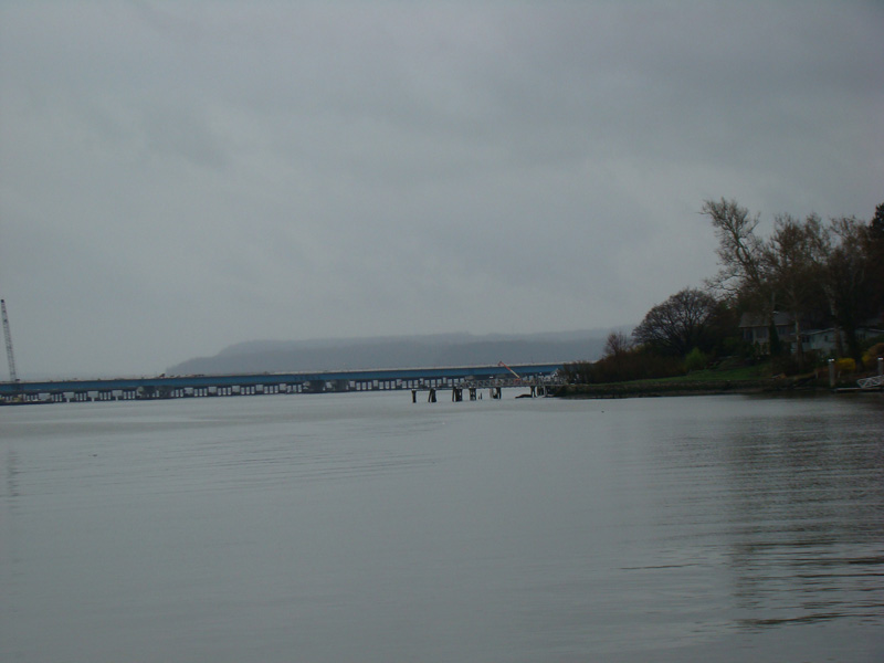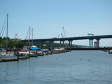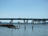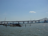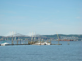 This picture shows the Tappan Zee Bridge as observed from Piermont shortly after the new bridge opened to traffic. The old bridge had been partially demolished at the time.
