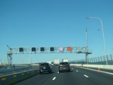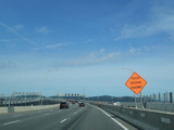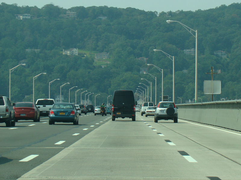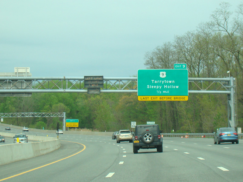 The original Tappan Zee Bridge had a center lane that was reversible. These electronic signs directed motorists approaching the bridge to get out of the left lane when center lane on the bridge was carrying traffic in the opposite direction.