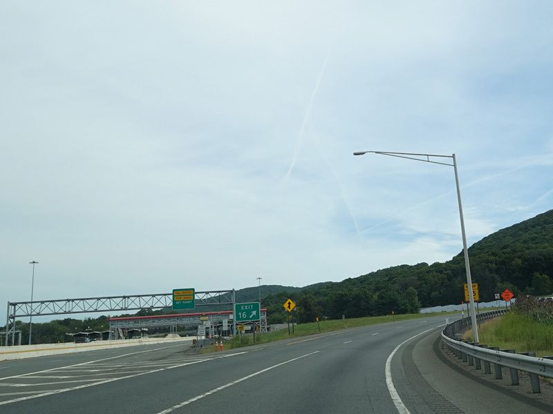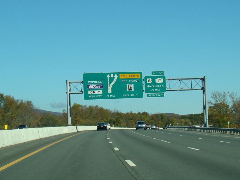 Prior to the introduction of cashless tolling on the Thruway, there was a toll plaza at exit 16. The Thruway split into two sets of lanes. The inner lanes were express lanes for E-ZPass only, while the outer lanes had tollbooths for cash.