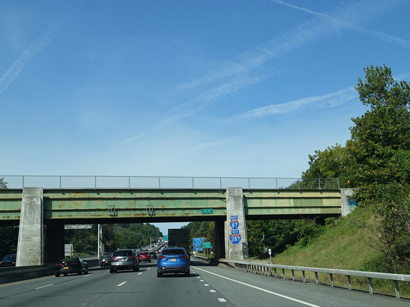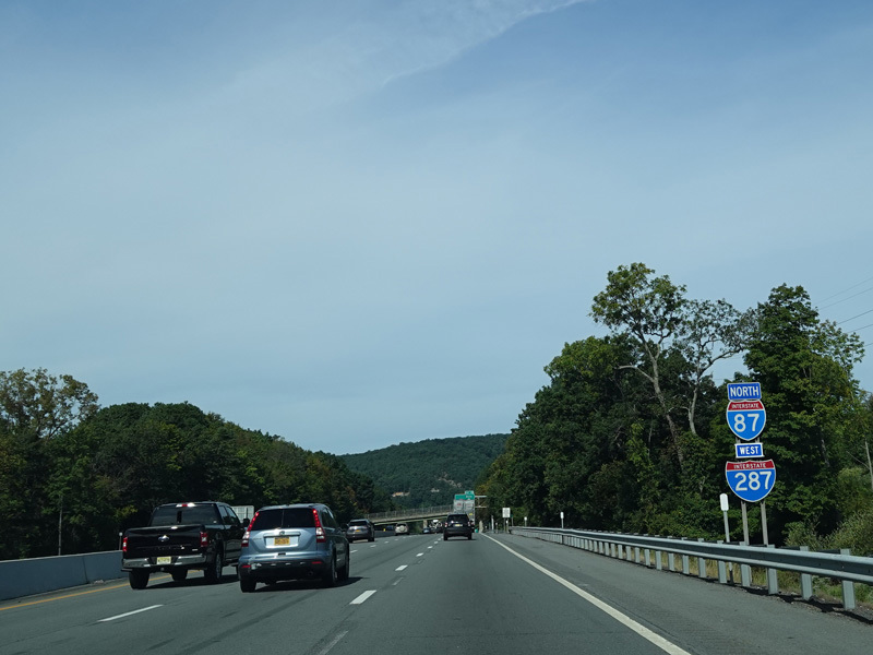 Exit 15 is for I-287/NJ 17 south. The I-87/I-287 multiplex ends at this exit. I-87 passes right next to the border between New York and New Jersey at this point. Therefore, there is an exit for a New Jersey state route, even though I-87 remains entirely in New York. At the state line, NJ 17 becomes NY 17, which is multiplexed with I-87 north along the Thruway for one exit beginning here.