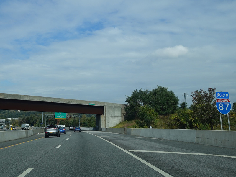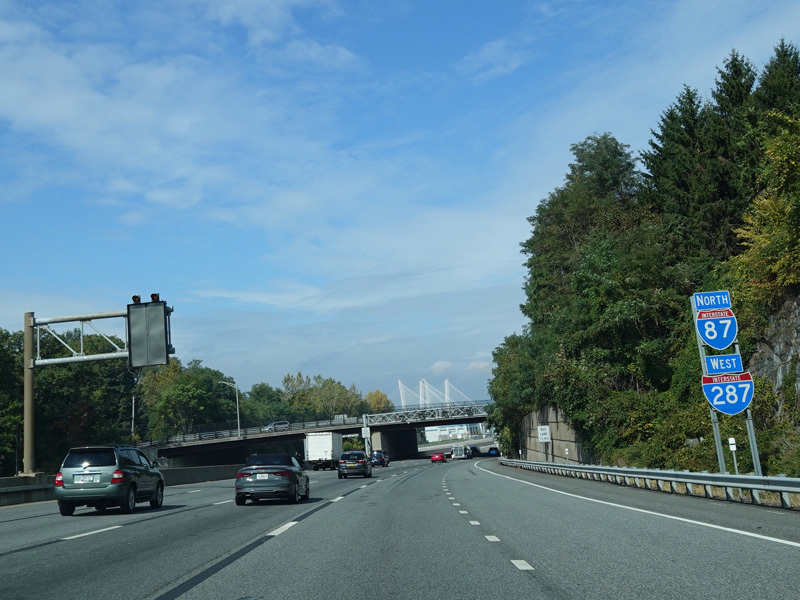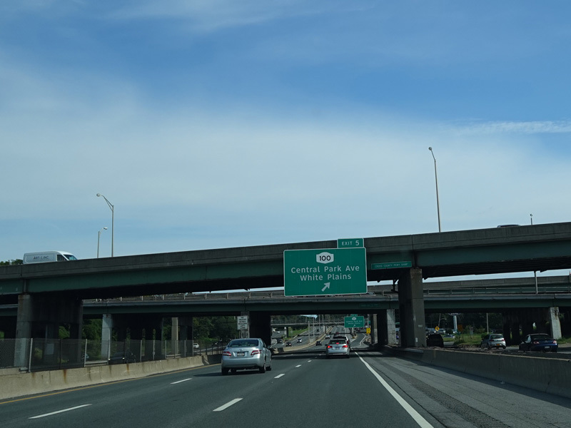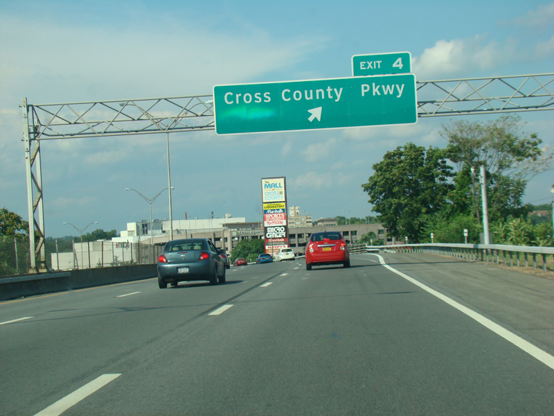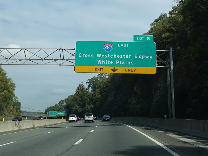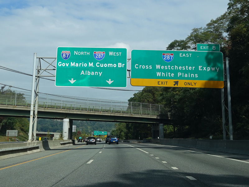 Exit 8 is for the Cross Westchester Expressway (I-287) east. It also provides access to NY 119 and the Saw Mill Parkway north. I-287 west is multiplexed with I-87 north along the Thruway straight ahead.