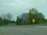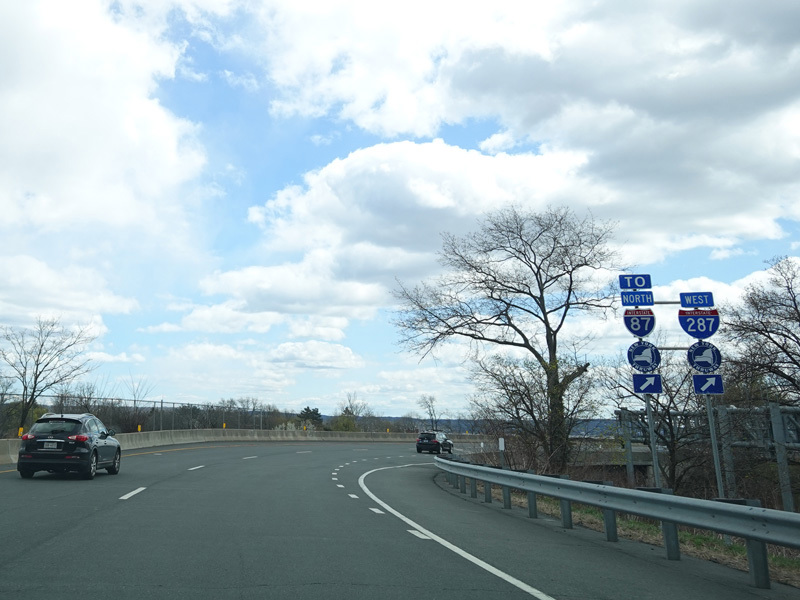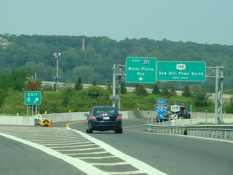 The ramp for exit 8 of the northbound Thruway splits. Bear left for the Cross Westchester Expressway (I-287). Bear right for NY 119 and the Saw Mill Parkway north.